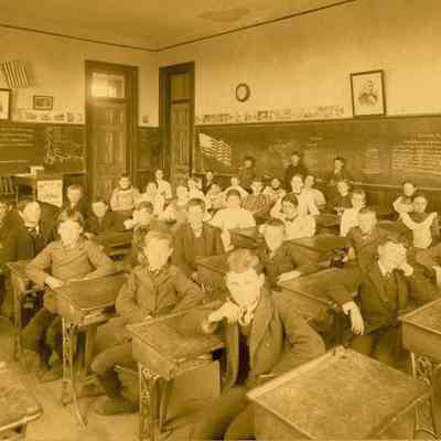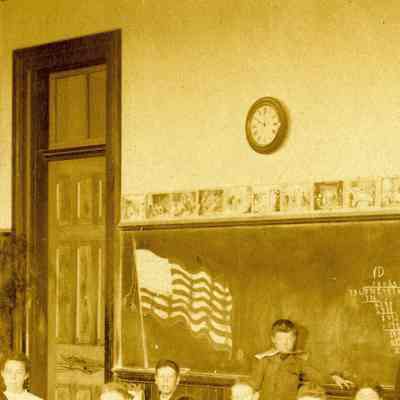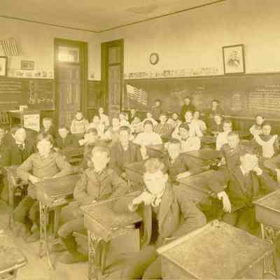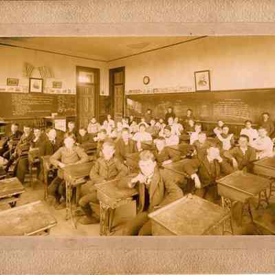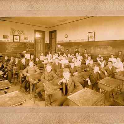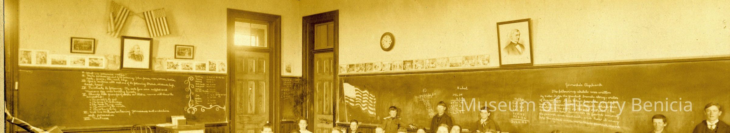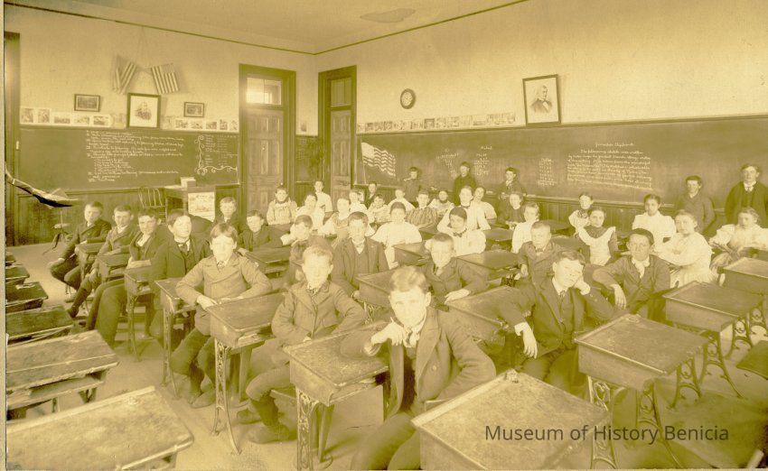 Benicia class photo taken in the early 1900s. The photo was taken in the classroom. Students are sitting at their desks with some students at the chalk board.Collection