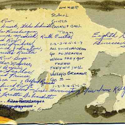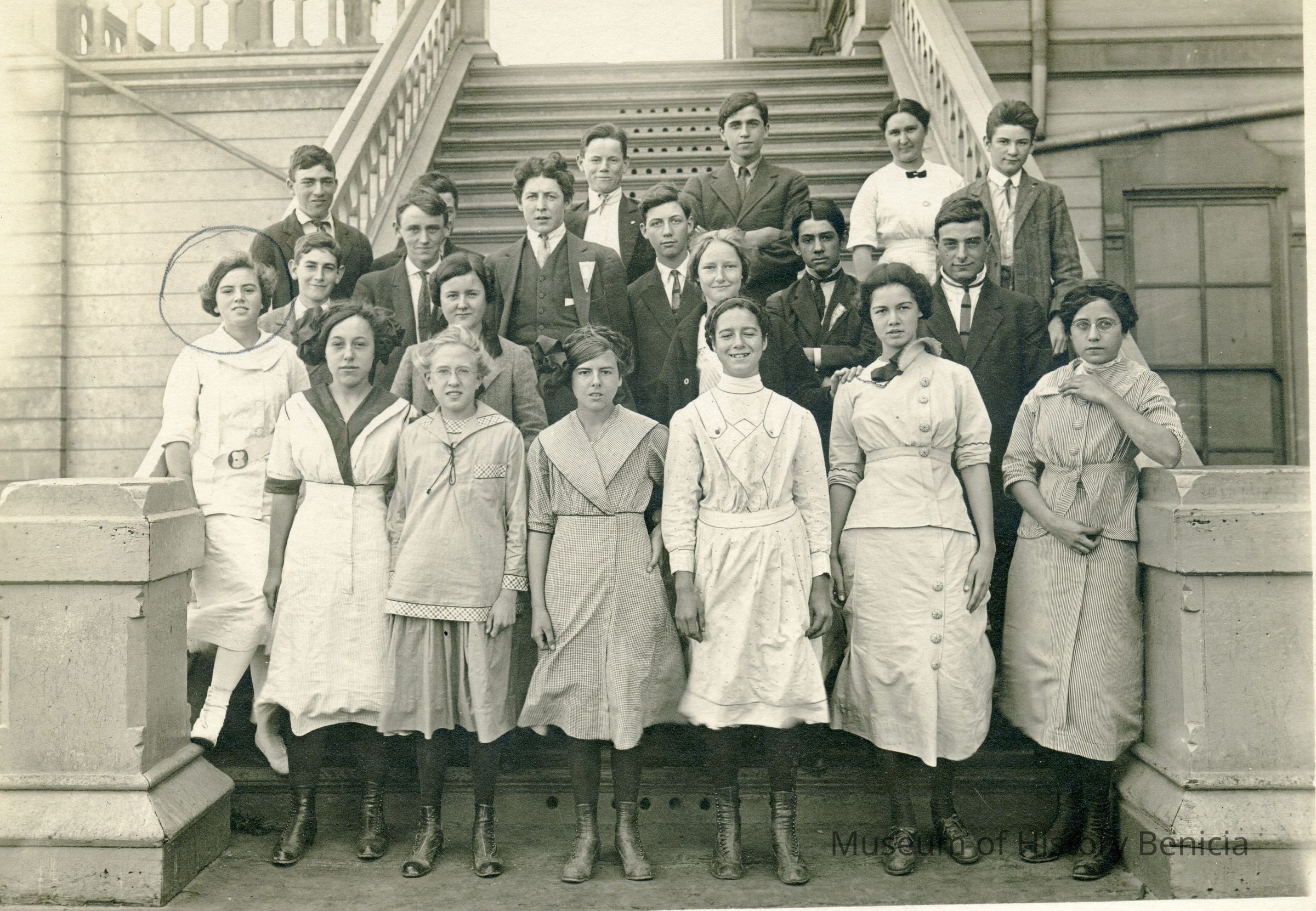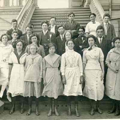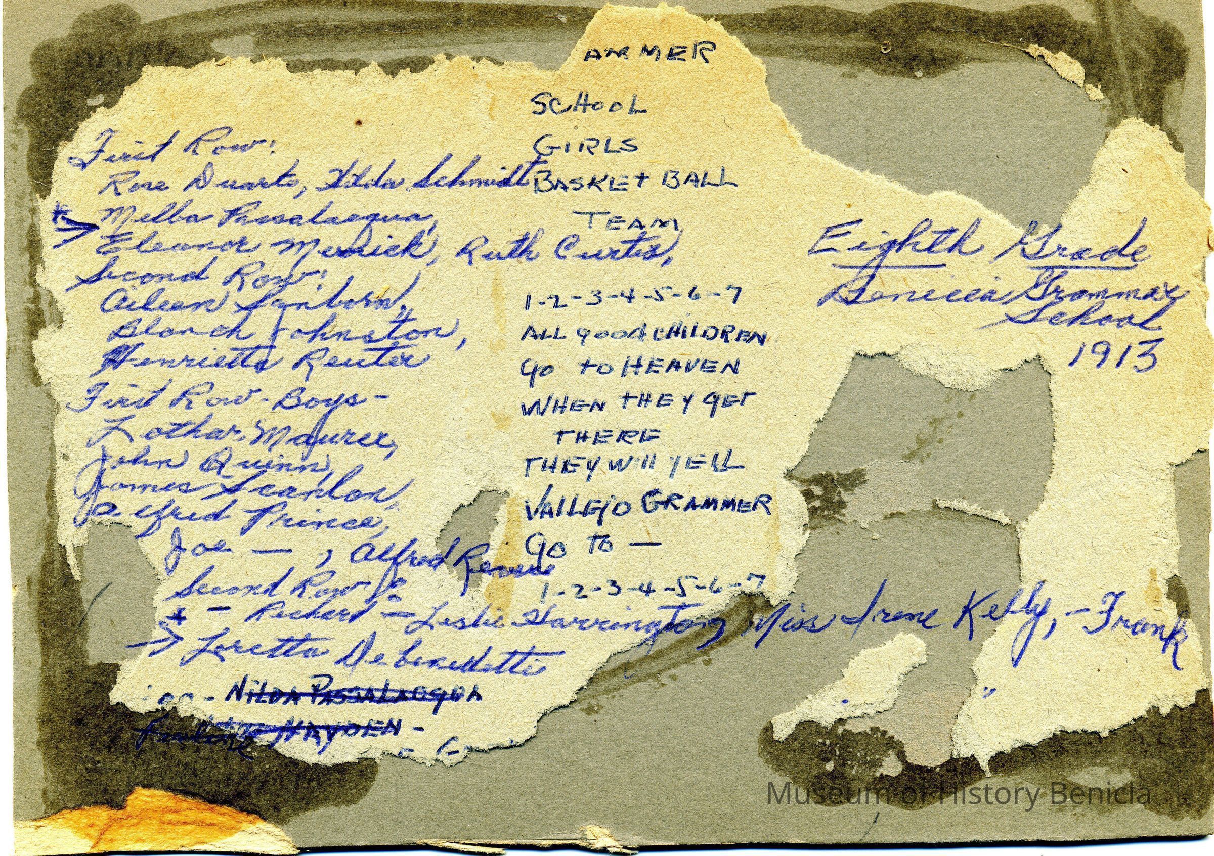 Benicia class photo taken in 1913. The photo was taken on the steps of the old Grammar school. Writting on the back identifies it as the Eighth grade class at Benicia Grammar School in 1913. It also mentions the "school girls basket + ball". The names of the students are listed along with a cheer: