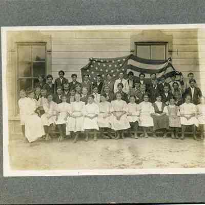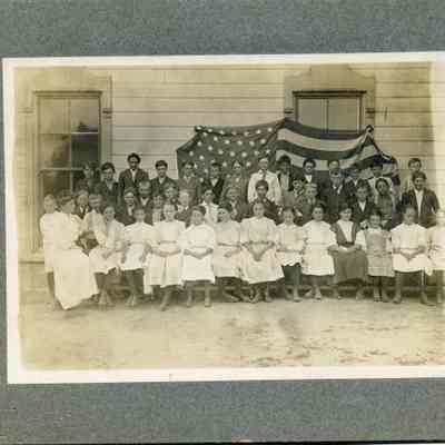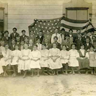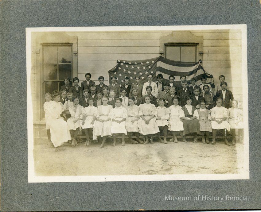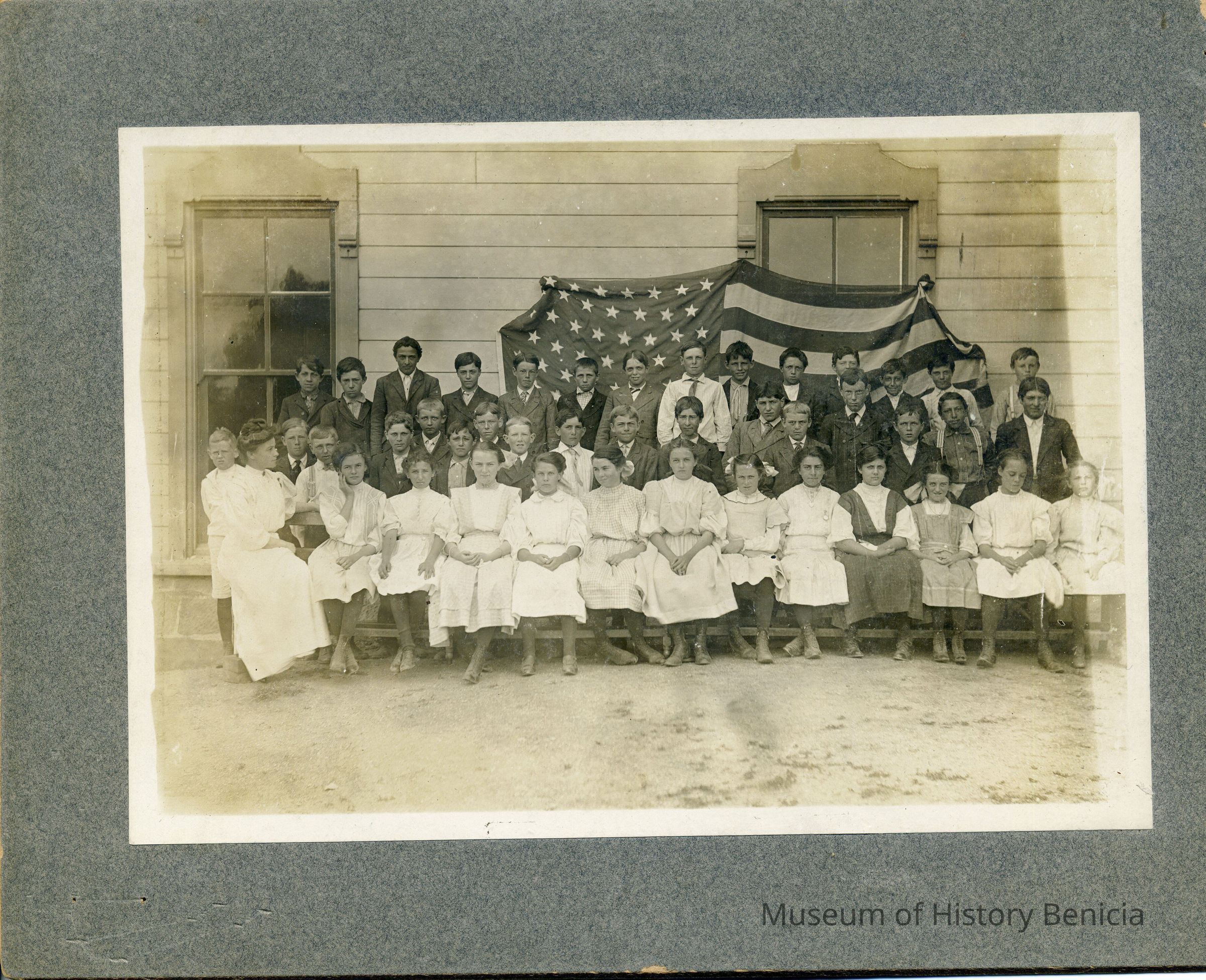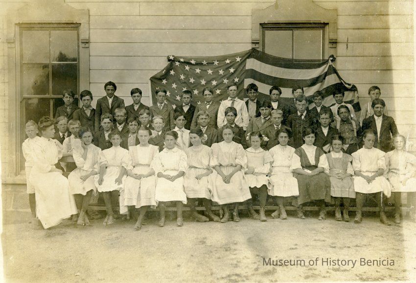 Benicia class photo taken in the 1900s. The photo was taken next to the school (not sure which Benicia school). There is an American flag behind the children. The flag looks like either a 45 or 46 star flag. The difference is that one star was added to the 46 star flag in the fourth row from the top making it an 8 star row rather than a 7 star row. I think this flag has 7 stars in the fourth row making it a 45 start flag from 1896 to 1907. (This same flag is also in the record 2017.099.0011 and can clearly be seen as a 45 star flag.)Collection