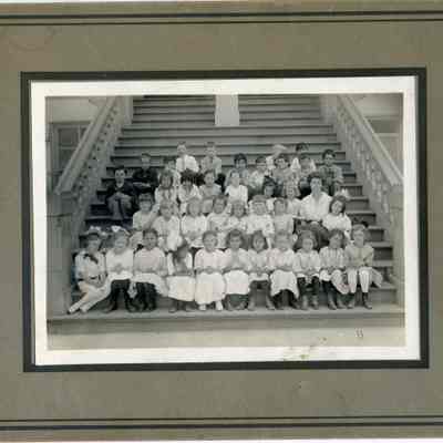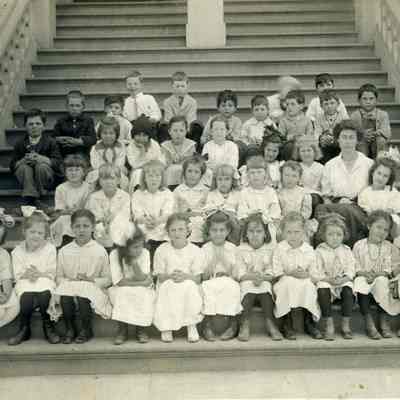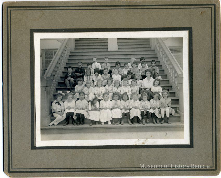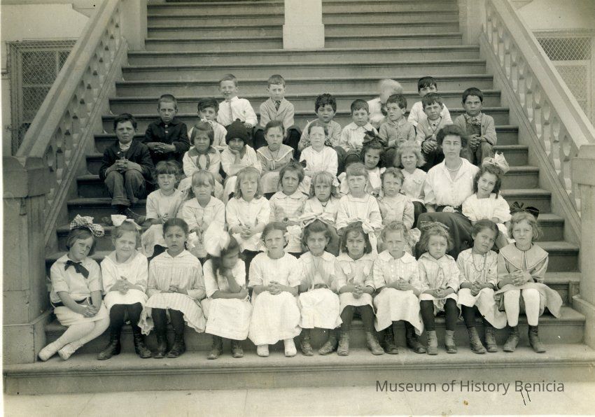 Benicia class photo taken on the steps of the old Grammar school. The students look like 2nd or 3rd graders.