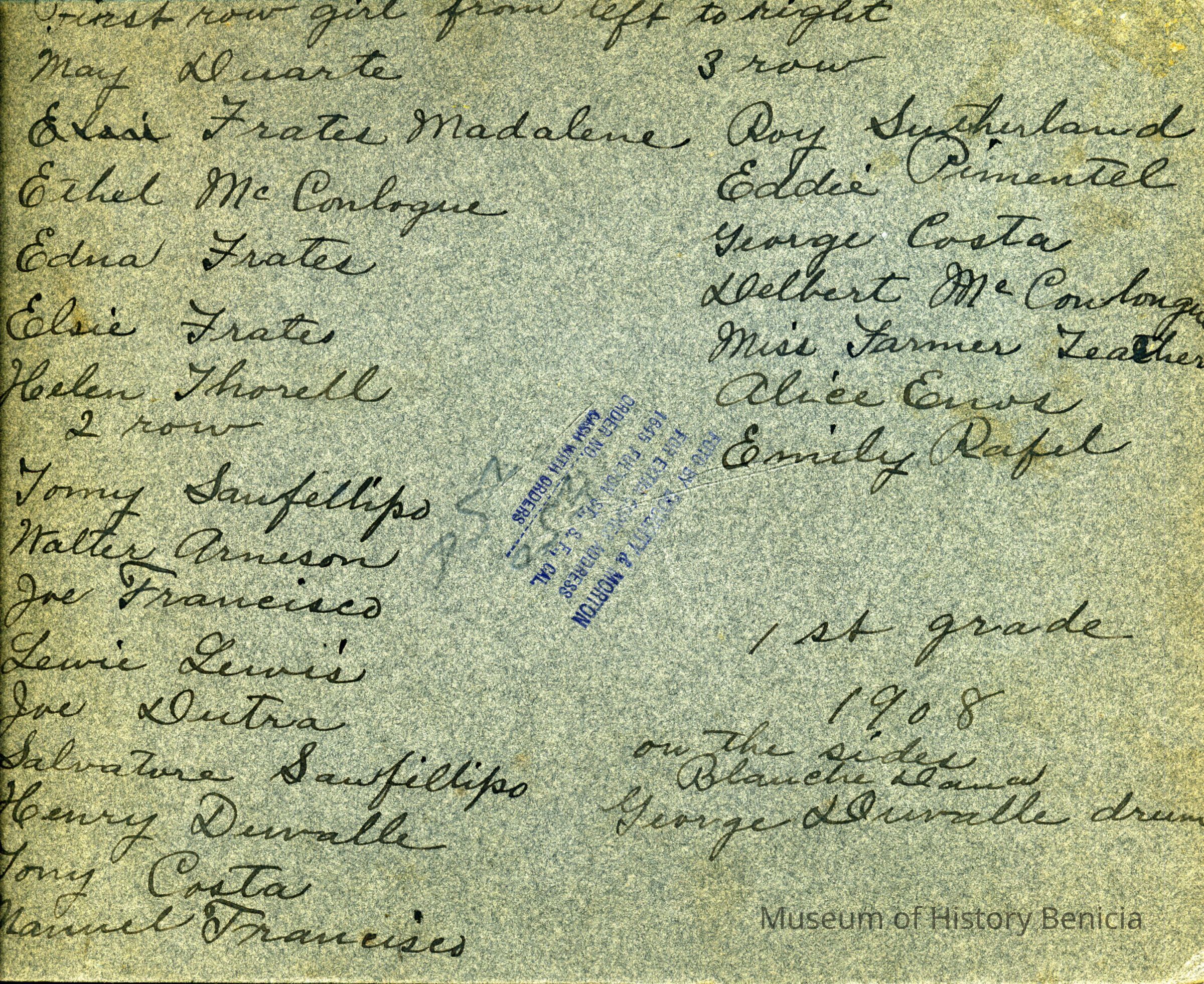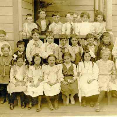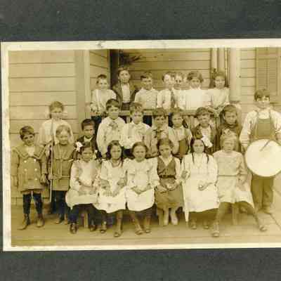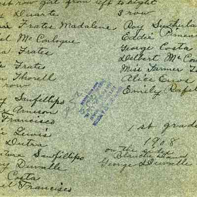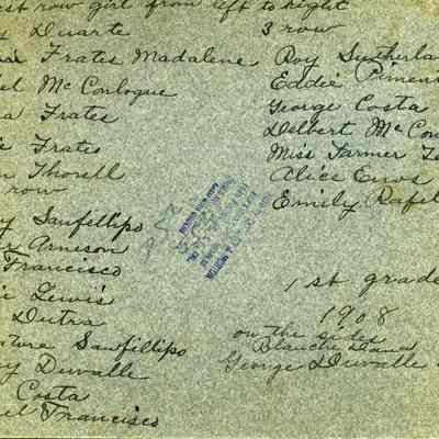 Photo of a grade school class taken in front of a building. On the back it hasthe date 1908 and says this is a First Grade class. It also lists the names of the students: