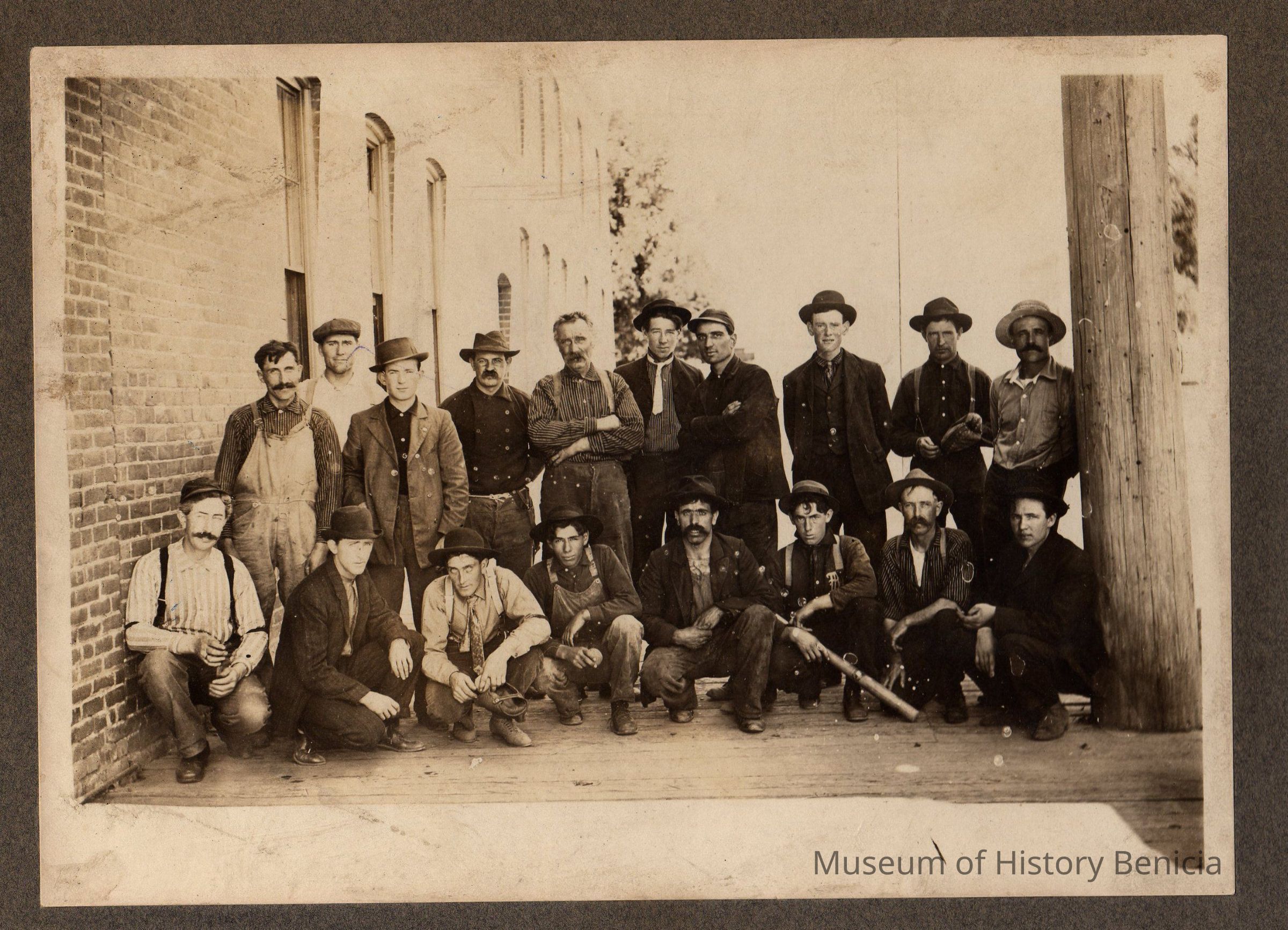 Black and white photo of tannery workers posing on walkway by Kullman Salz Tannery. Louie McClain: second row, third from right; Joe Santos: second row, fourth from right.Collection