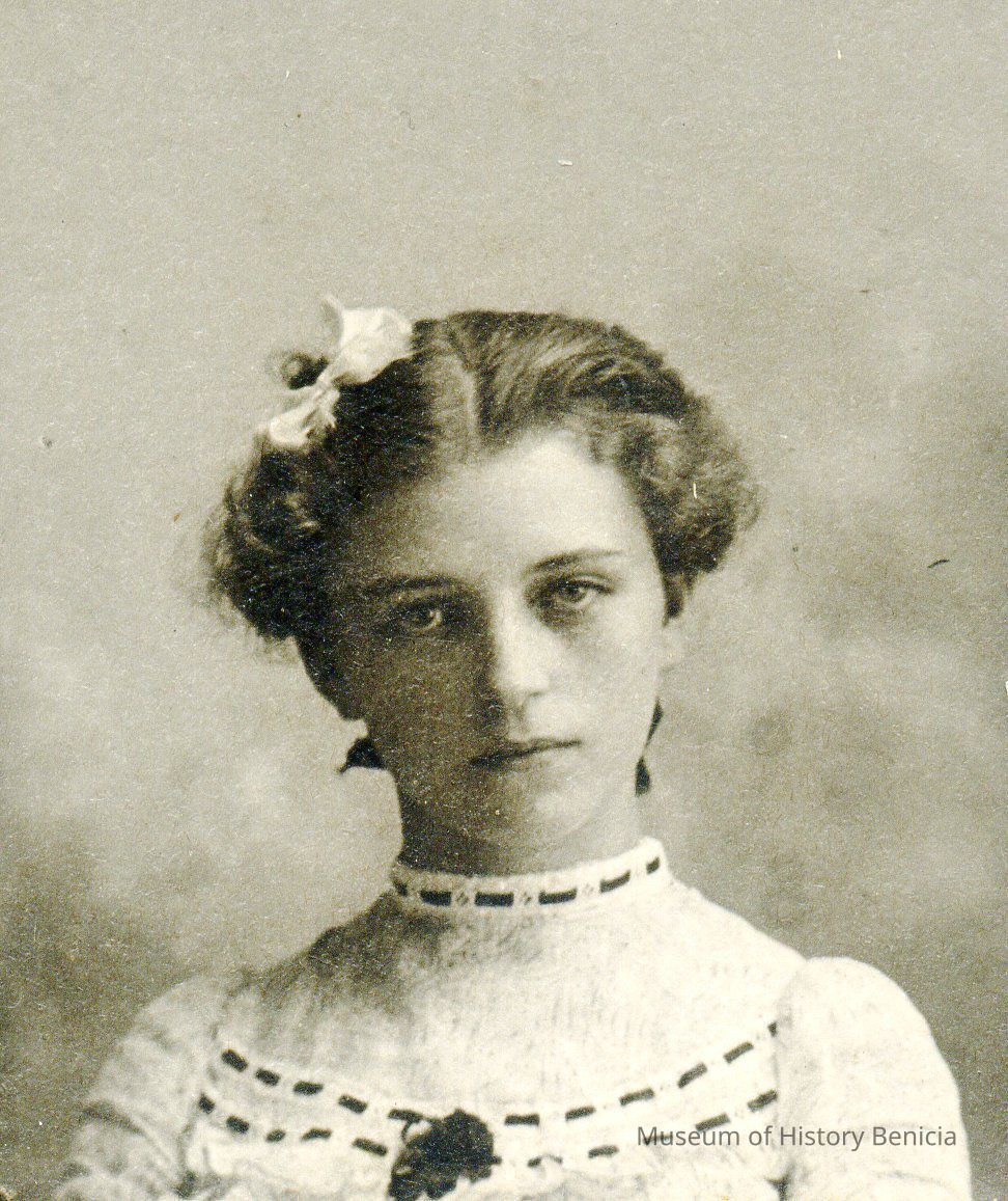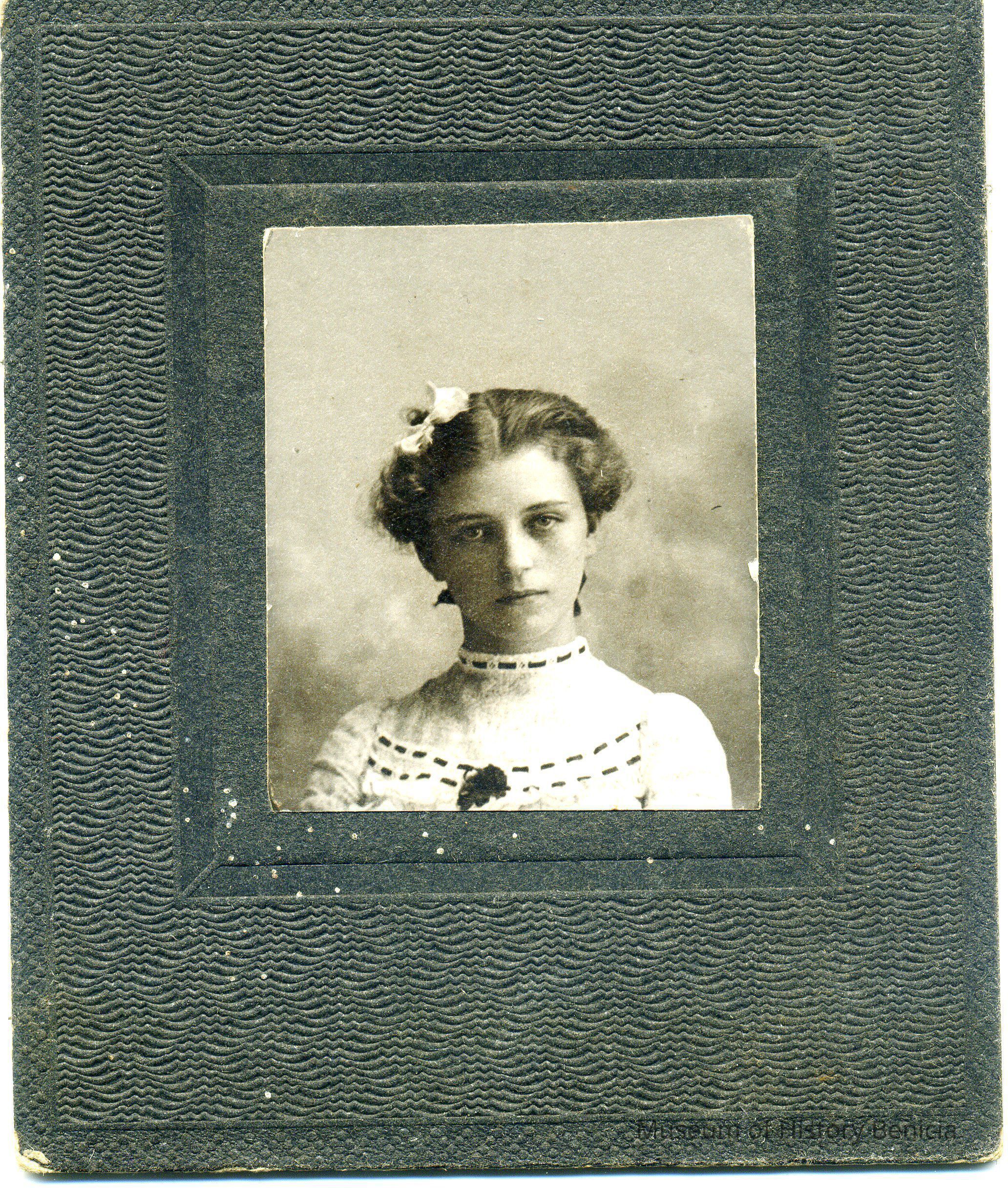 A tiny cabinet card showing a young woman. The back of the photo has no identification but this is probably Erma Montgomery Wright, wife of Thomas Wright.Collection