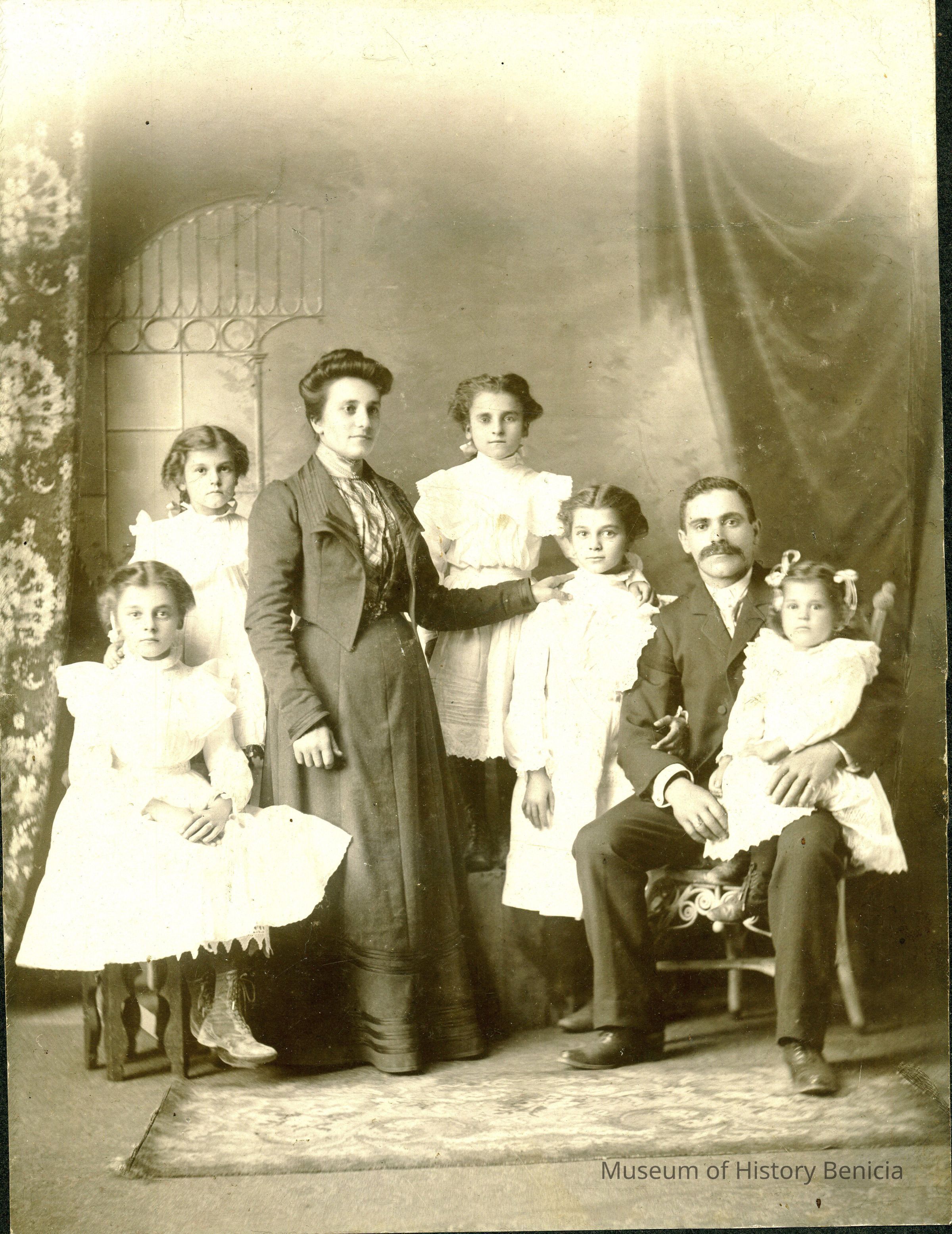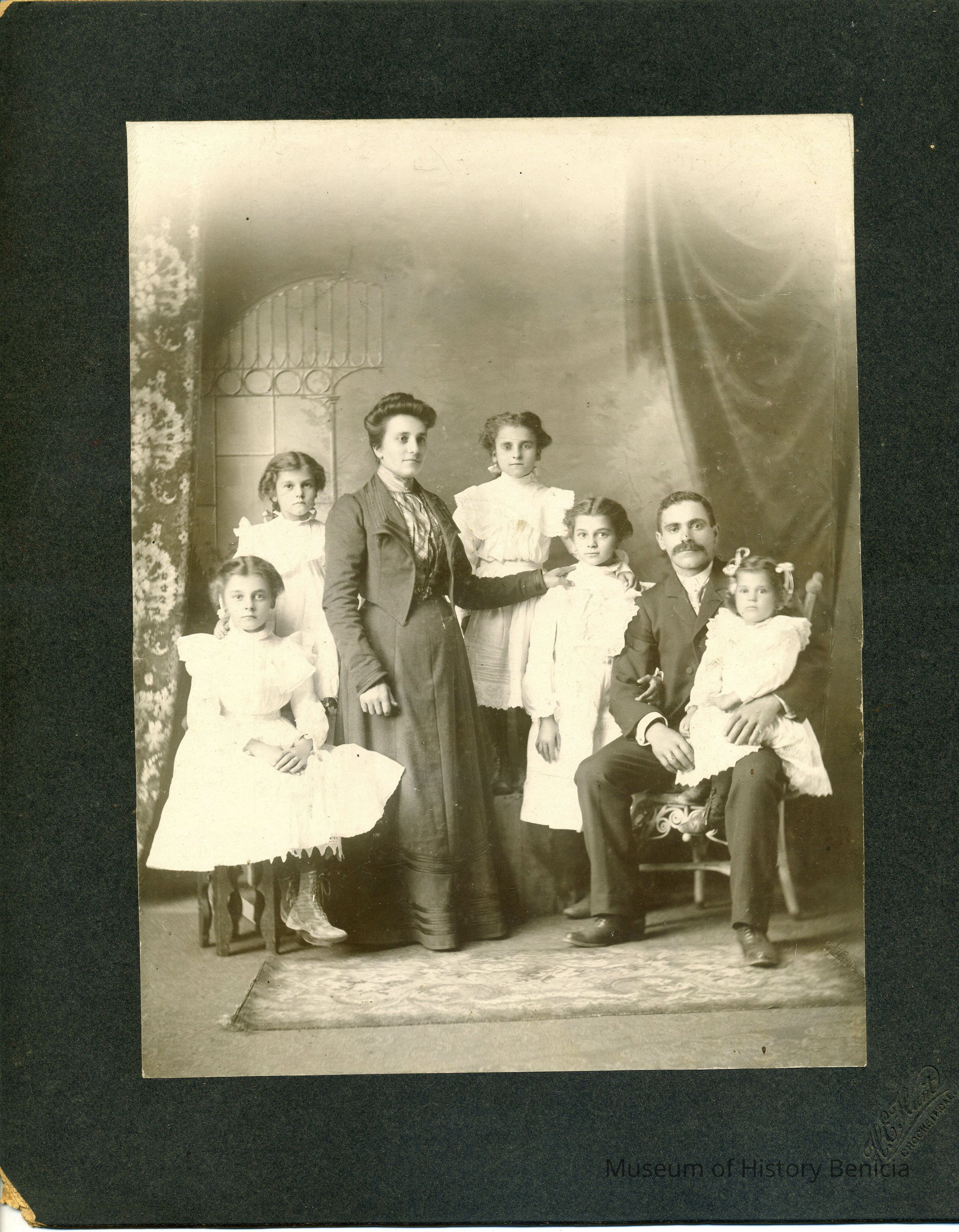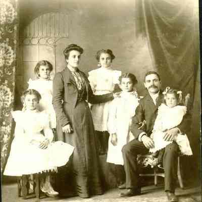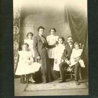 This is a photo of Mrs. Lawrence and family. This is what is written on the back of the photo. It is a large studio portrait of a couple and their five daughters.Collection