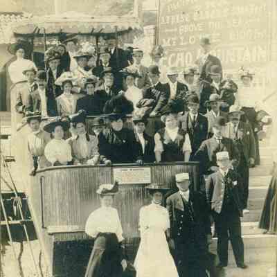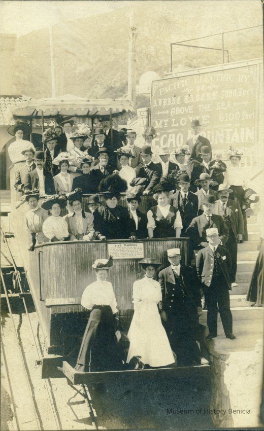 This is a photo of a group of people on a railroad trolley. The sign on the right says "Pacific Electric RY" and Mt Lowe - 6100 feet. It also references Echo Mountain.
