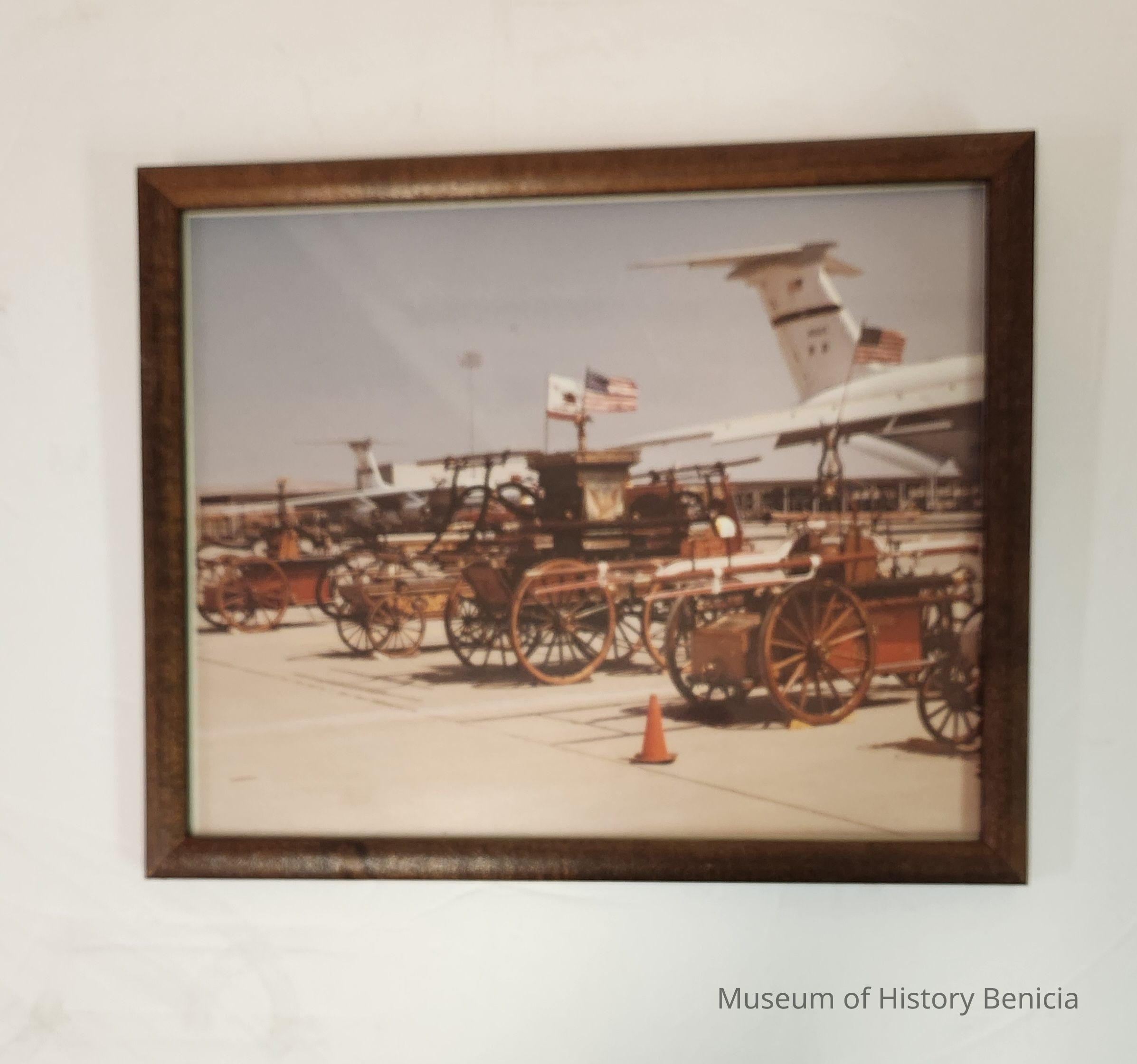 Color Photograph in 1/2" brown frame, under glass. It is a line of pumpers (including the Phoenix) at Travis AFB in 1983.