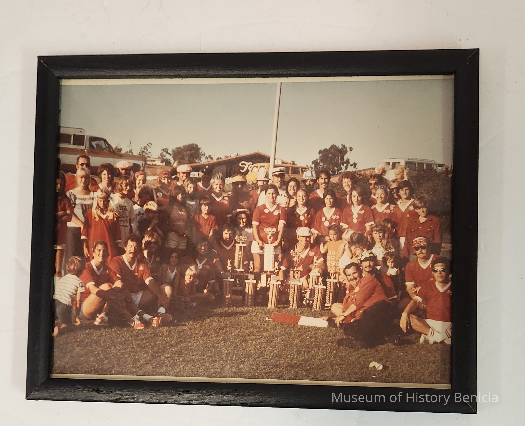 Color Photograph in a 1/2" black frame, under glass. It is a group of participants in the Benicia Firemen's Muster 1975.