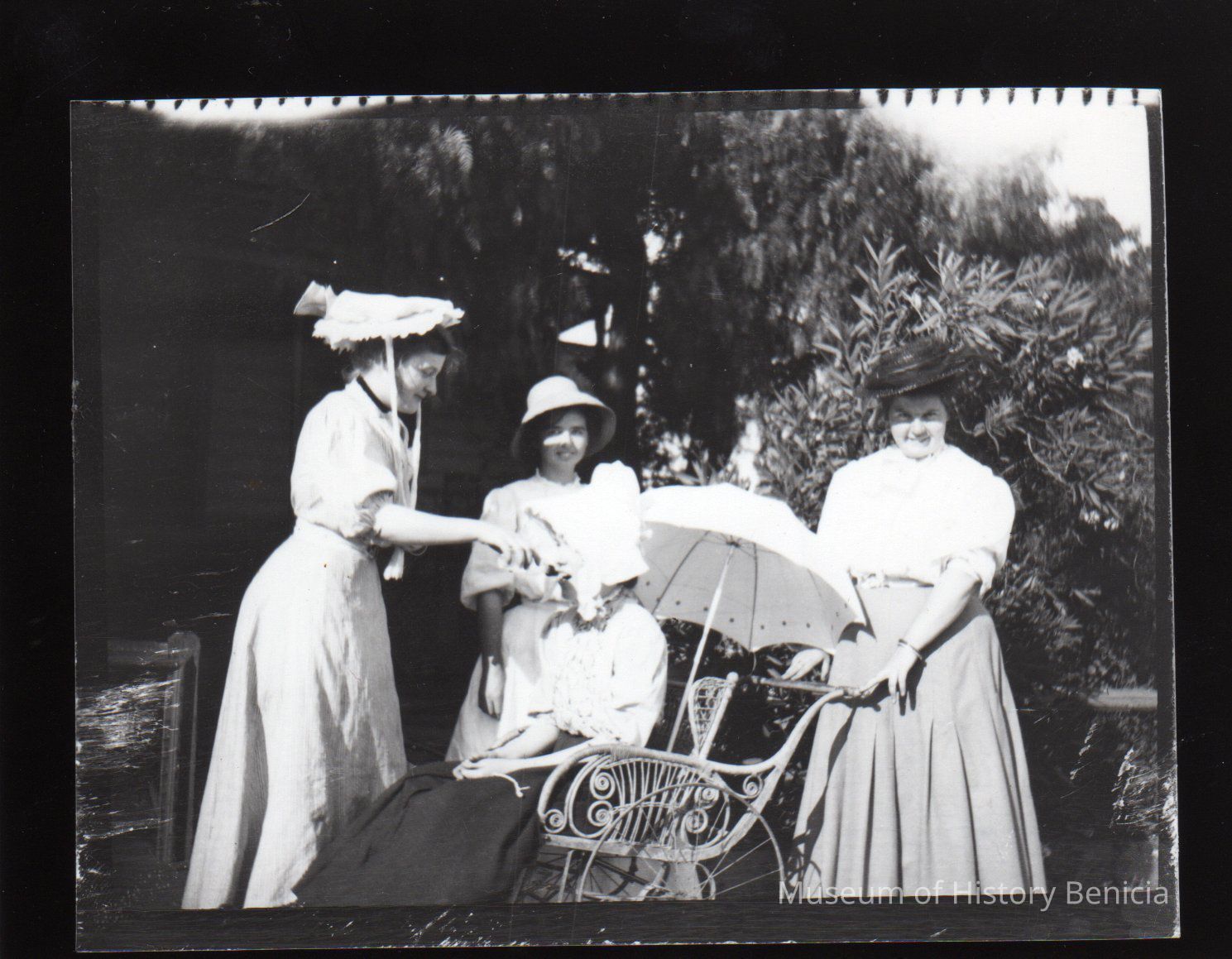 Black and white photo of four ladies with one of them seated in a wheelchair being given a drink from a bottle.