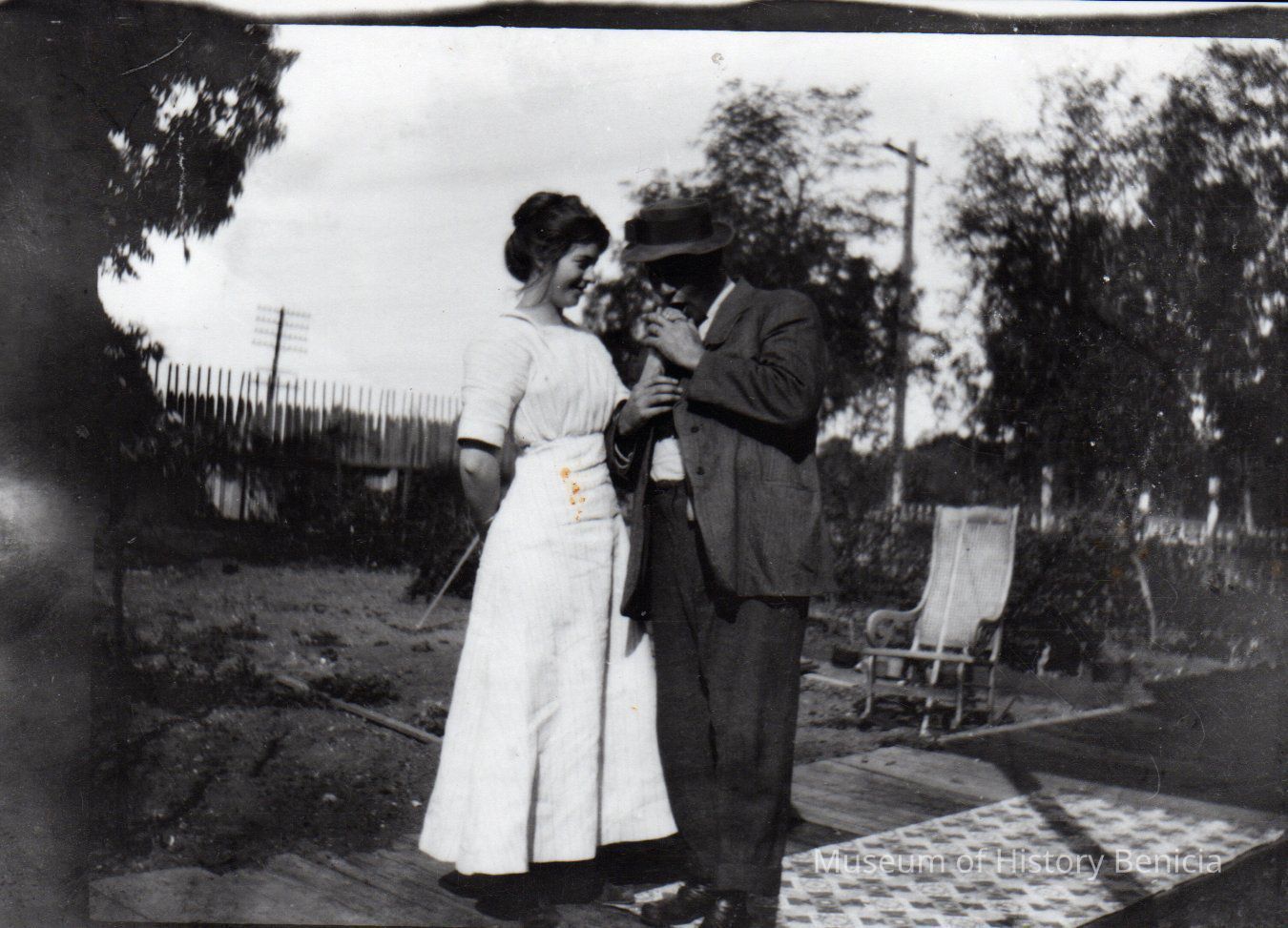 Man and woman in garden. He is kissing her hand. B/W photo.