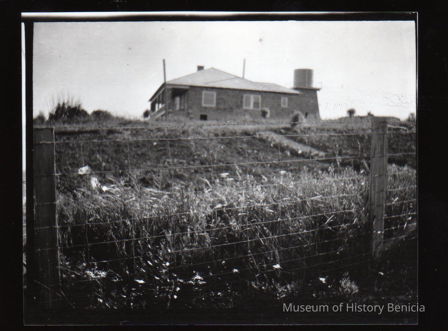 Black and white photo of house with water tower.