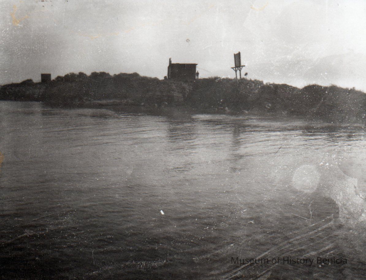 Water view of area of underwater explosion to clear obstruction. Black and white photo.