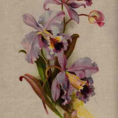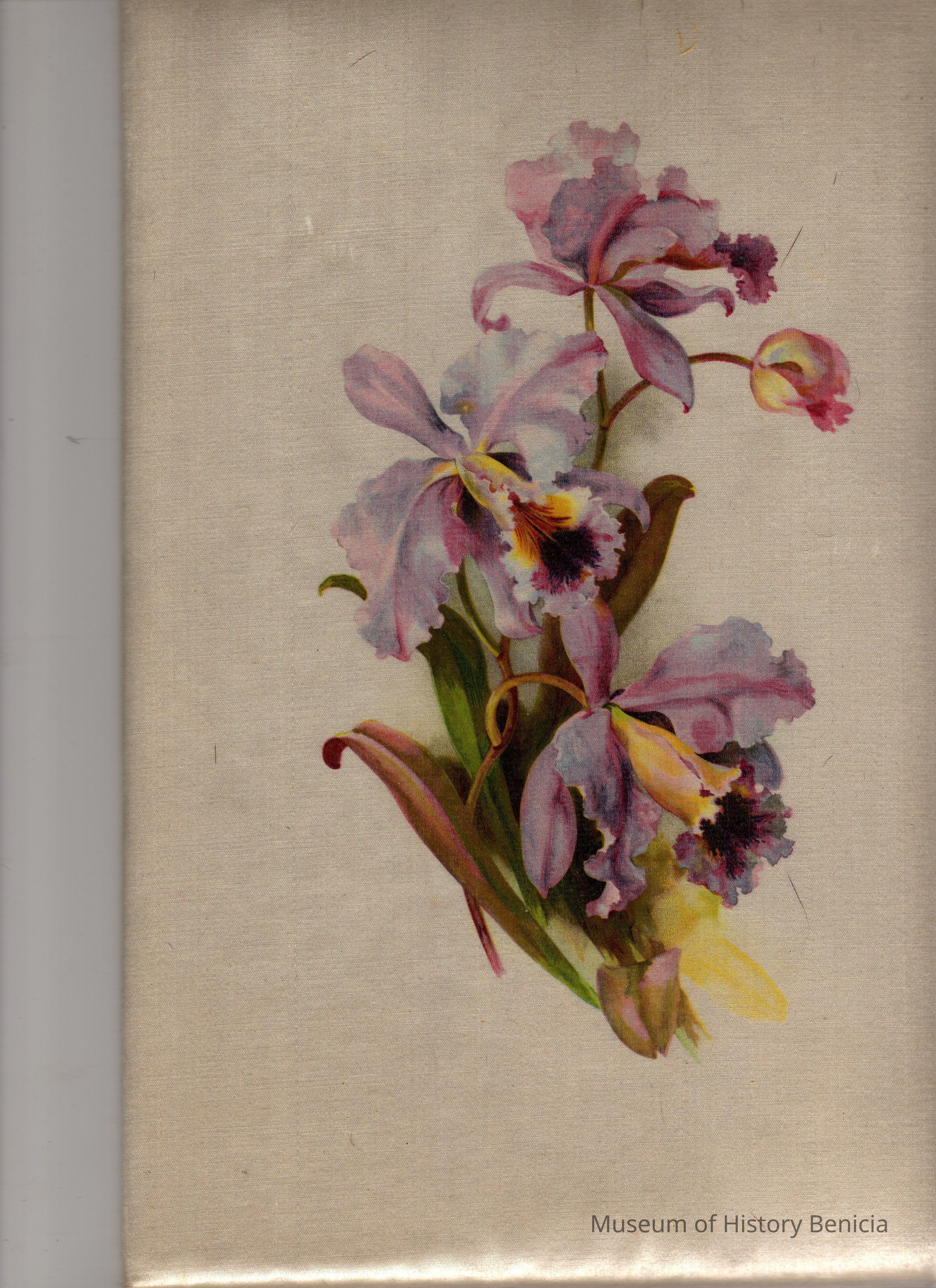 silk screen of orchids on a white silky background; cardboard backing, slight padding