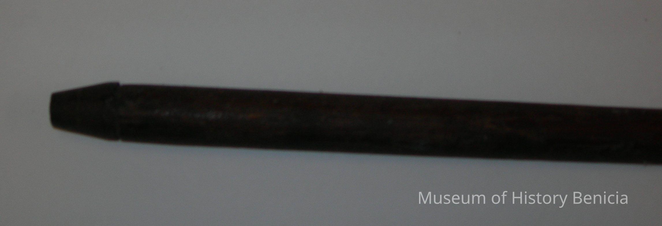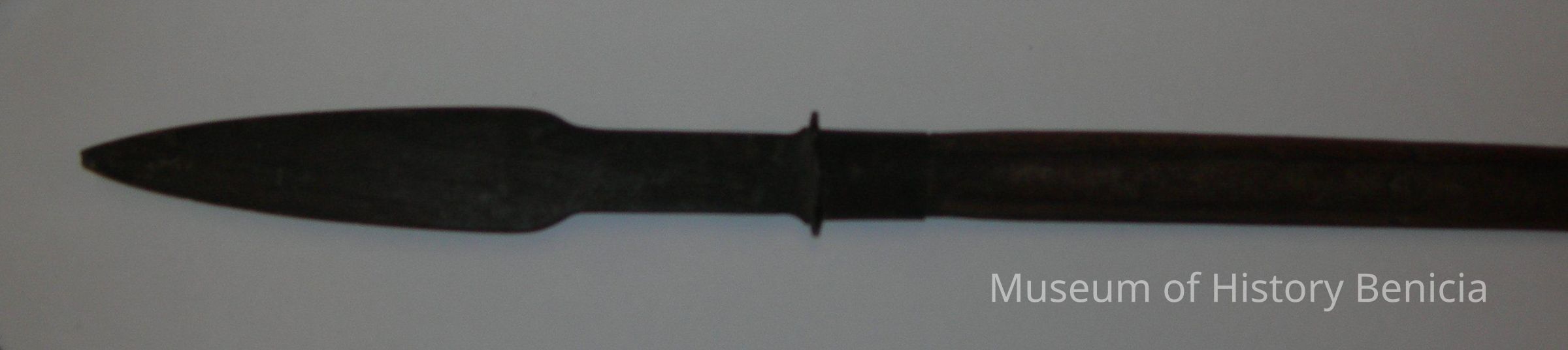 Eight-Foot long Pike - wooden handle, at one end in an iron, two-sided/double-edged pointed 9" long blade; total length of the metal blade plus its attaching hardware held on by nails is 27" on the outside of the pole, the blade piece goes 10" into the pole; there is a metal end cap on the bottom end of the pole.Collection