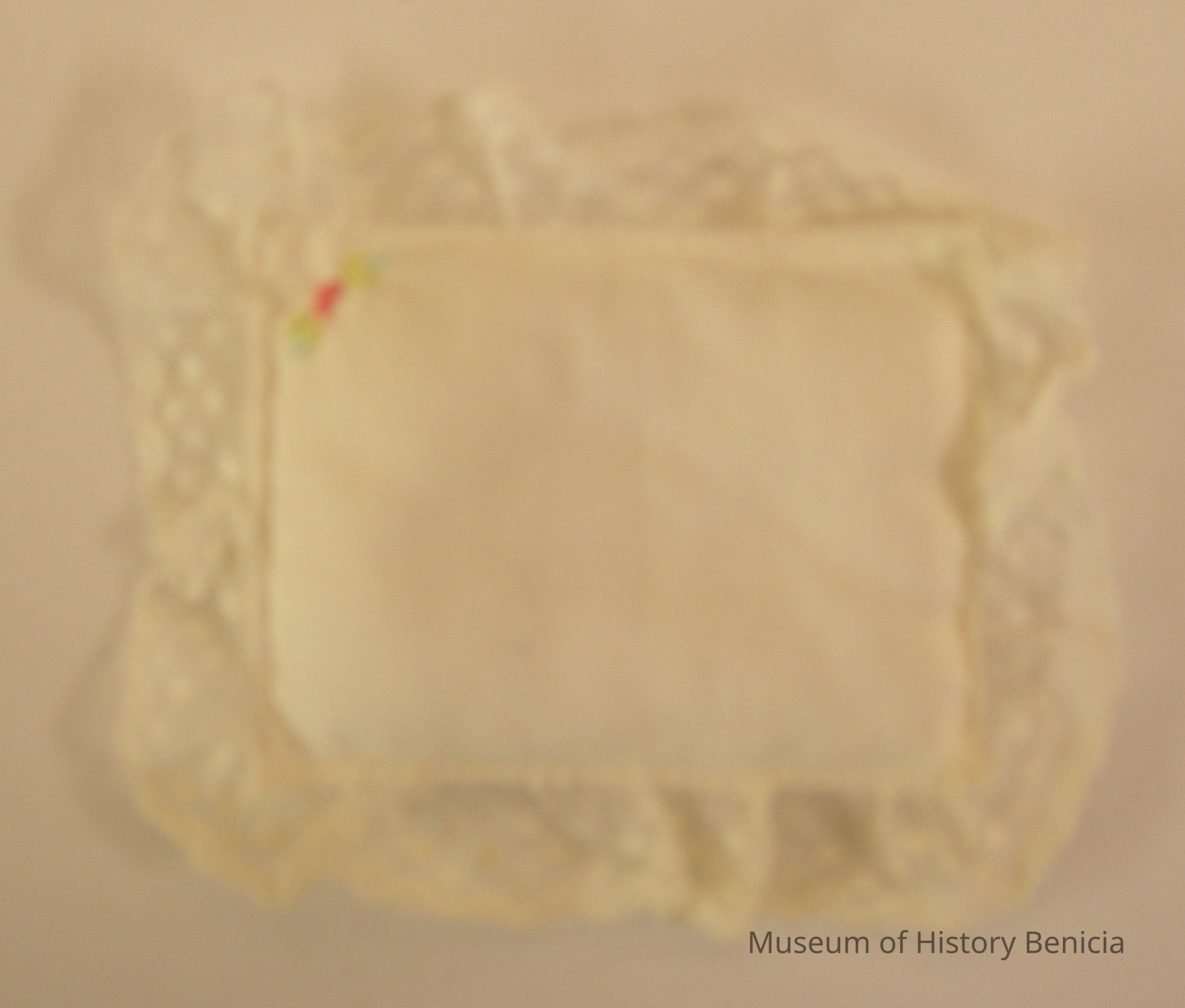Doll pillow - white cotton with lace trim all sides; embroidered flower in one corner of top; 4-1/2" x 4" including lace.