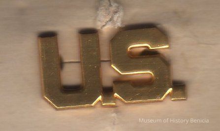 brass lapel pin "U.S."; attached by 2 push on clutch backs each on a post attached to a piece of cardboard