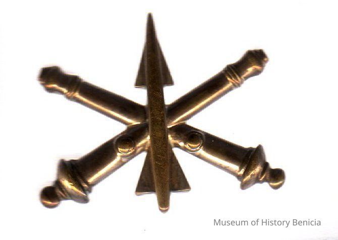 brass insignia - Army Air Defense Branch; air defense missle/weapon superimposed on crossed cannons; attached to lapel by 2 clutch/push-on backs each on a post