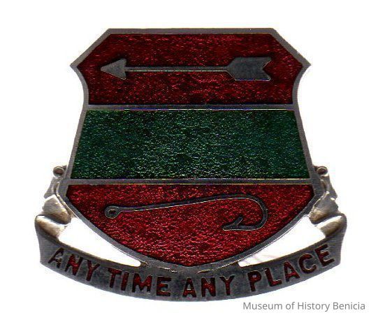 enameled military pin; shield shape w/banner below "Anytime Any Place"; a green bar goes side to side in the center; above is red background with silver arrow; below is a silver fish hook (barbed); straight pin w/lock attacher on back