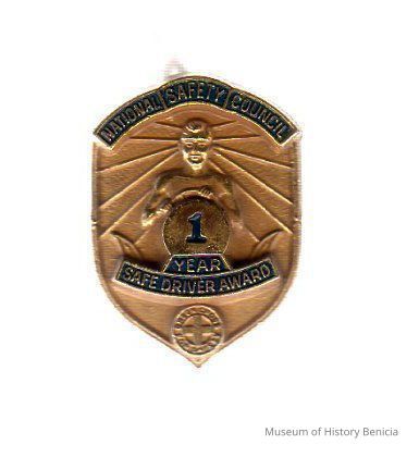 shield shape, nut screw back, gold background; top banner "National Safety Council" (gold on dark blue) below that is a human head and torso w/hands on steering wheel, radiating lines from behind head; circle in center (number) 1; below that two banners "year" and "safe driver award" (gold on dark blue) below that a circle with cross in center "Green Cross for Safety"