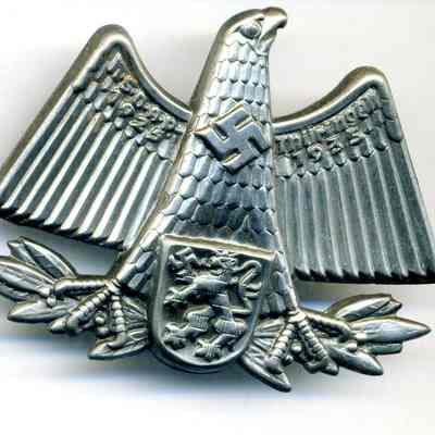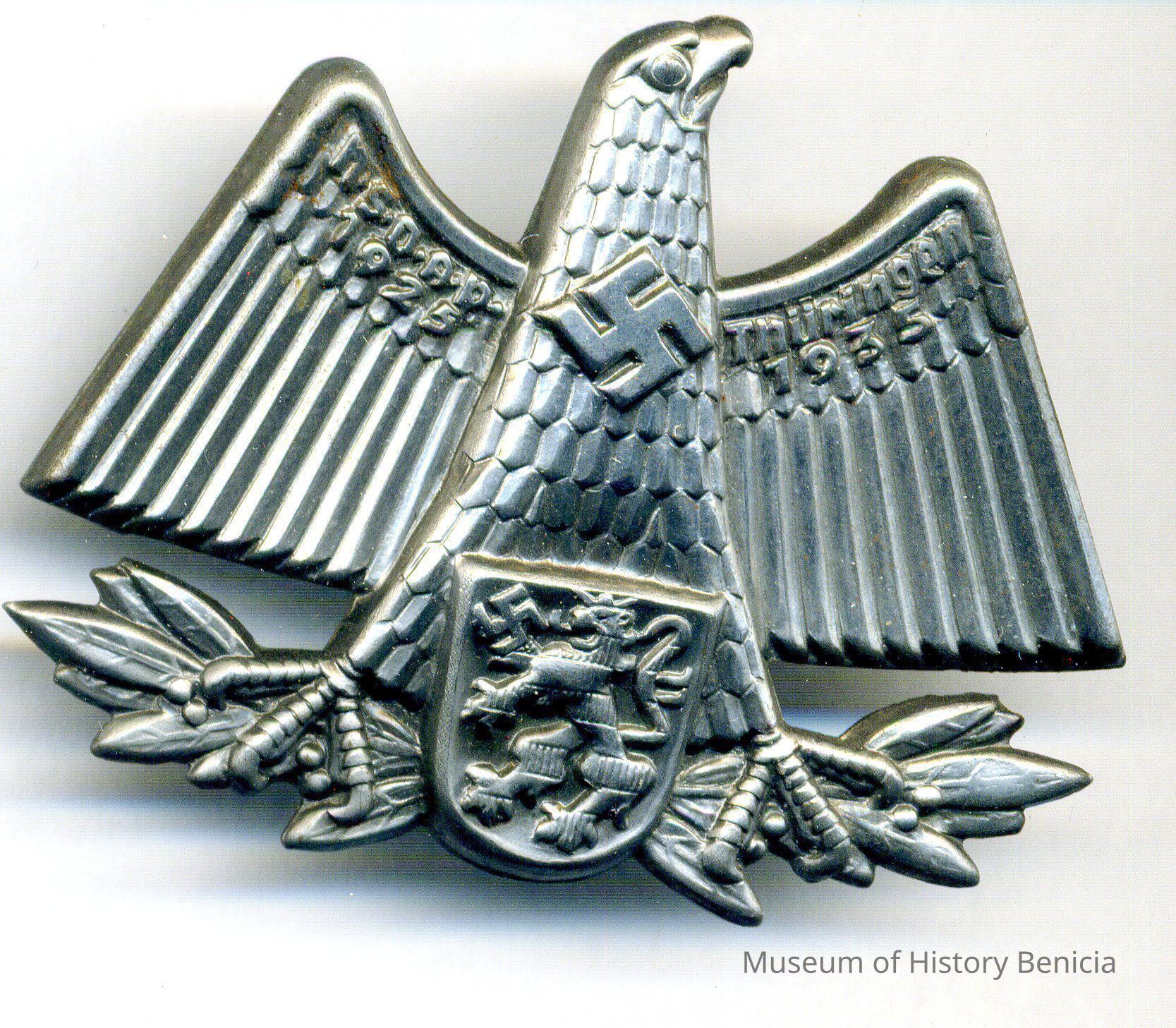 Nazi insignia - gray eagle with wings spread, swastika on chest "NSDAP Thuringen 1925-1935" along top of wings; soldered pin on back; maker's name reverse side of left wing (looking at front) too small to readCollection
