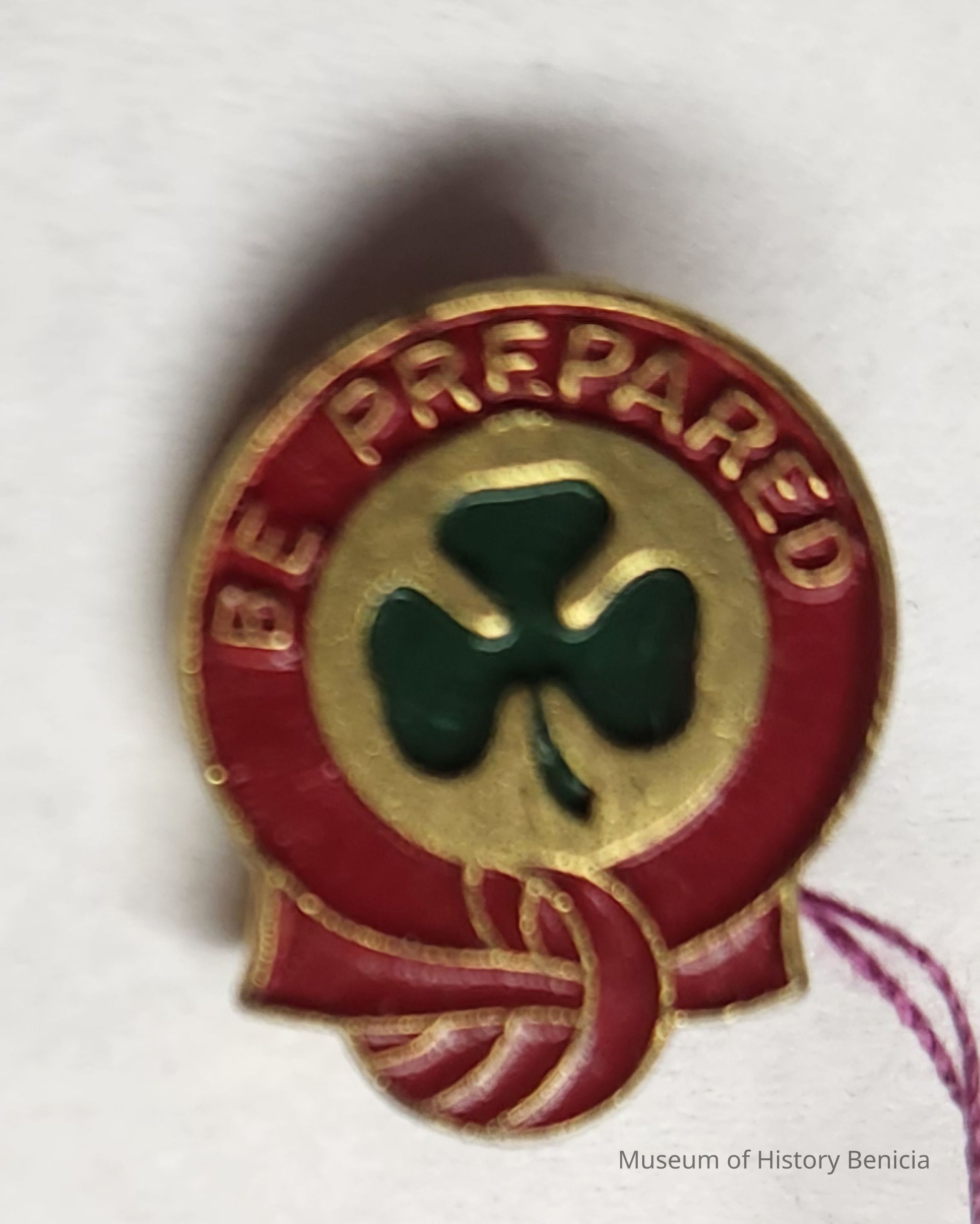 A pin with a shamrock in the center and a red ring around the edge. The words "be prepared" are in gold in the top of the red ring. It has a locking clasp.