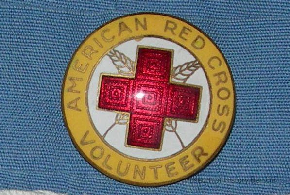 Red Cross Pin - round w/American Red Cross Volunteer around edge with red cross in center, worn on left breast above pocket on: [located inside plastic bag in pocket of dress]