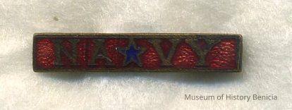 Pin - "N A (star) V Y" in gray on red enamel background, blue in center of star; straight pin with hook closure