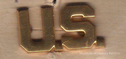 brass lapel pin "U.S."; attached by 2 push on clutch backs each on a post attached to a piece of cardboard