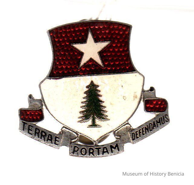 enameled military pin; shield top white star on red pebbled background, bottom green pine tree (for state of Maine) on white background/gold banner at bottom "Terrae Portam Defendamus"