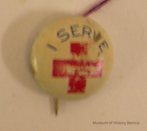 Round 5/8" diameter pin with white background, blue lettering: "I Serve" over a red cross; pin in very scrated on the top front; there is a straight shaft pin to attach to lapel
