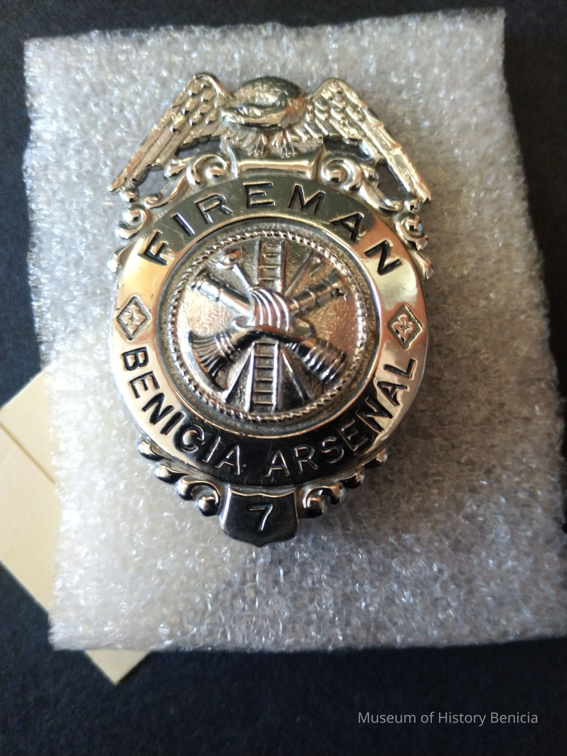 Silver colored metal badge for the Benicia Arsenal Firemen with fire logo in center - Badge number 7
