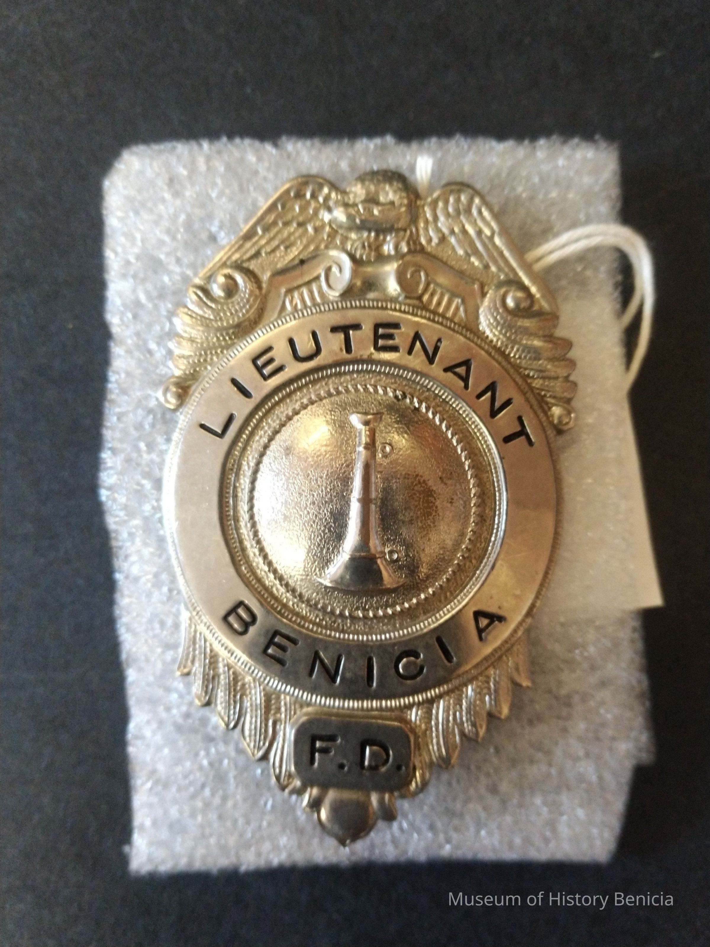 Silver colored metal Benicia Fire Dept. Lieutenant pin back badge with singel horn in the center of the badge Possibly a Ron Rice Piece