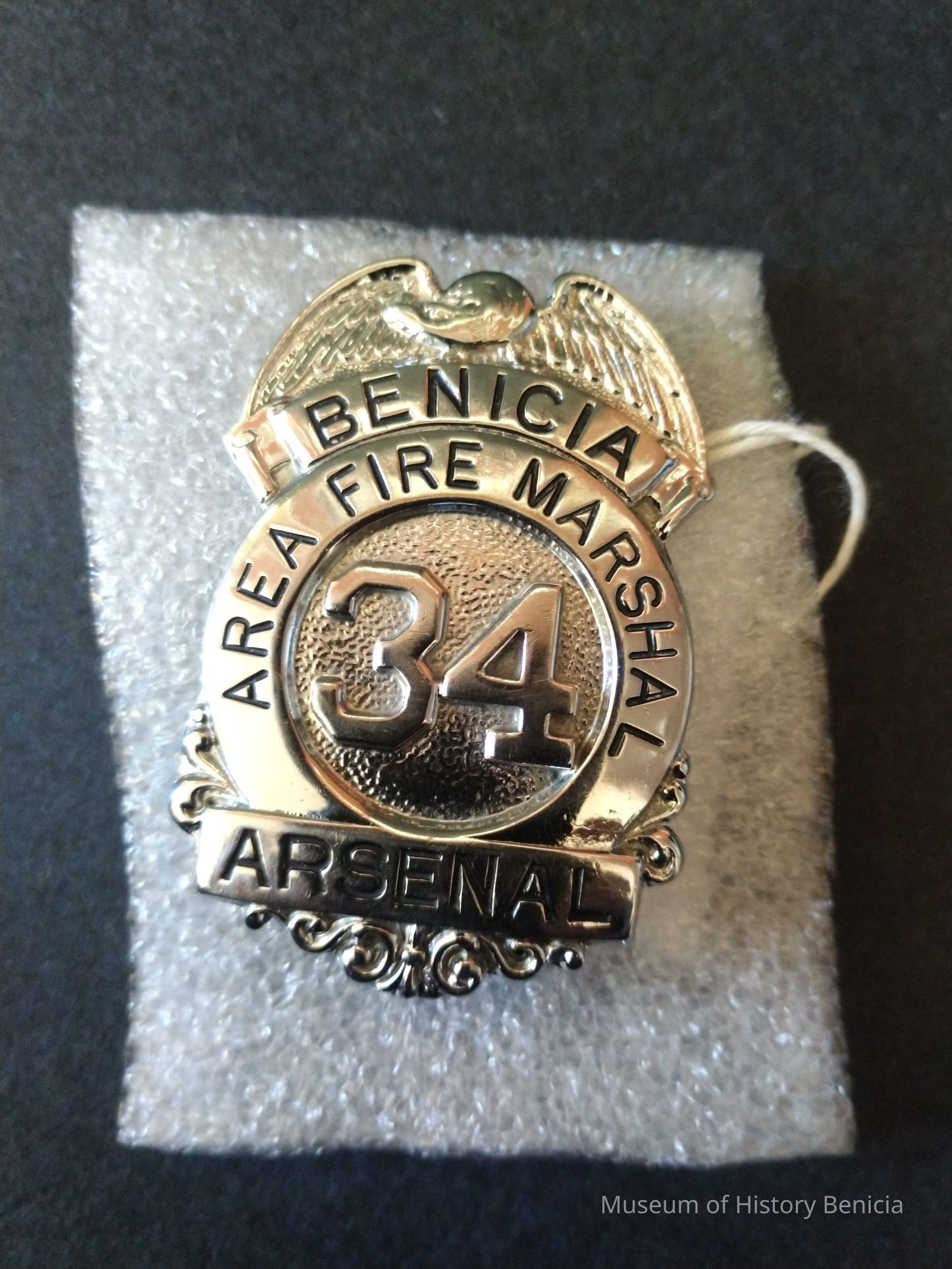 Silver colored metal Benicia Arsenal Area Fire Marshal pin back badge. Badge number 34