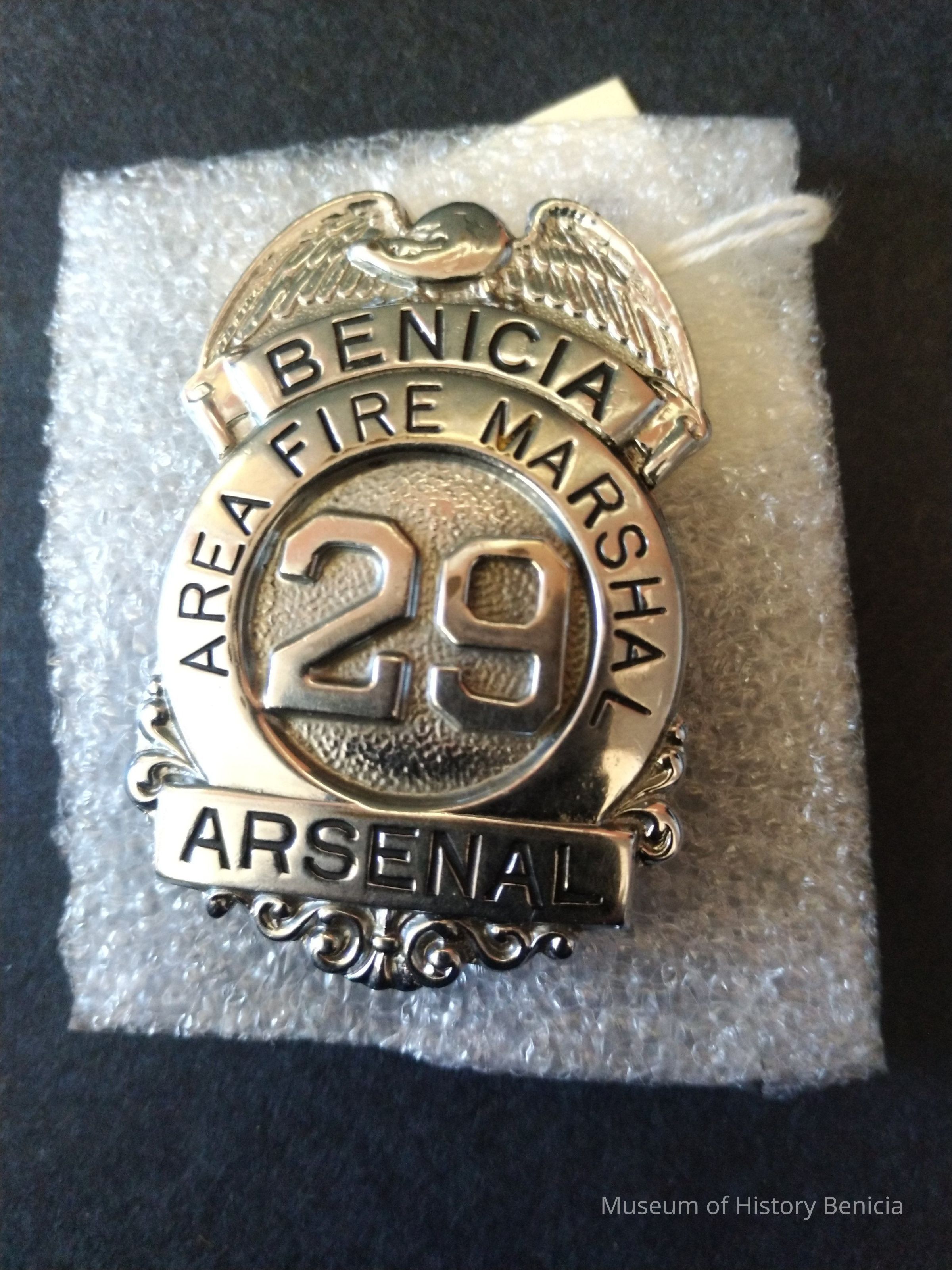 Silver colored metal Benicia Arsenal Area Fire Marshal Badge with pin back - Badge number 29