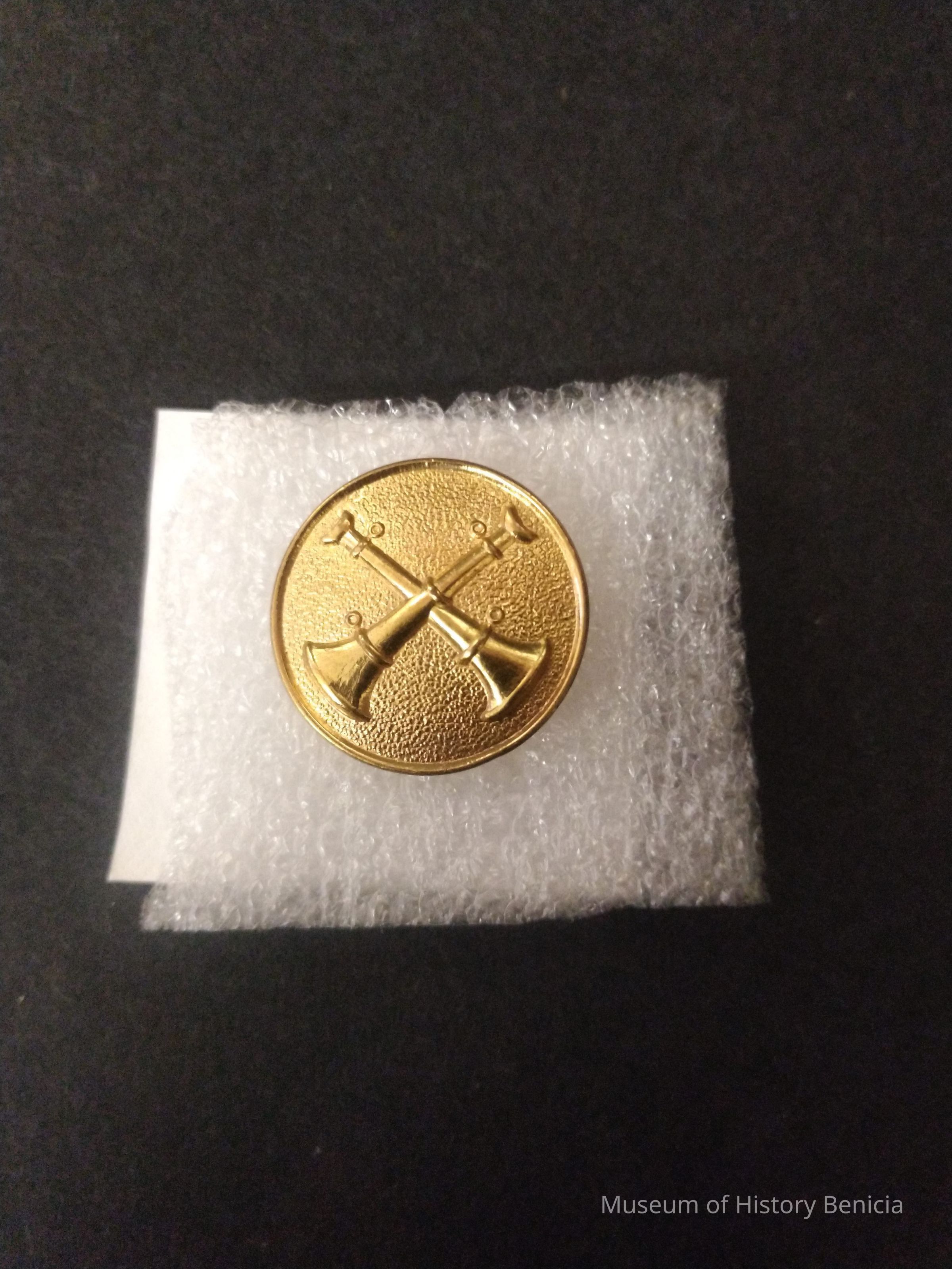 Gold colored metal crossed hors on a disk - 2 pring attachmetns on reverse - Rank Insignia - Possibly a Ron Rice Piece