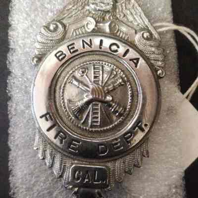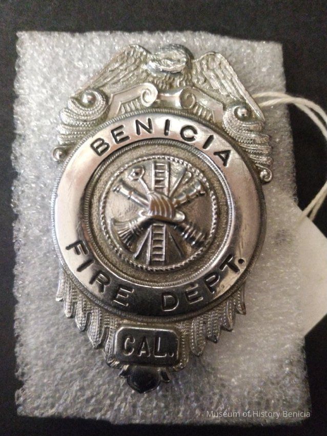 Silver colored metal Benicia Fure Dept. CAL. Badge - Pin Back - Sticker on reverse = W.R. Kendrick Loaned 041289