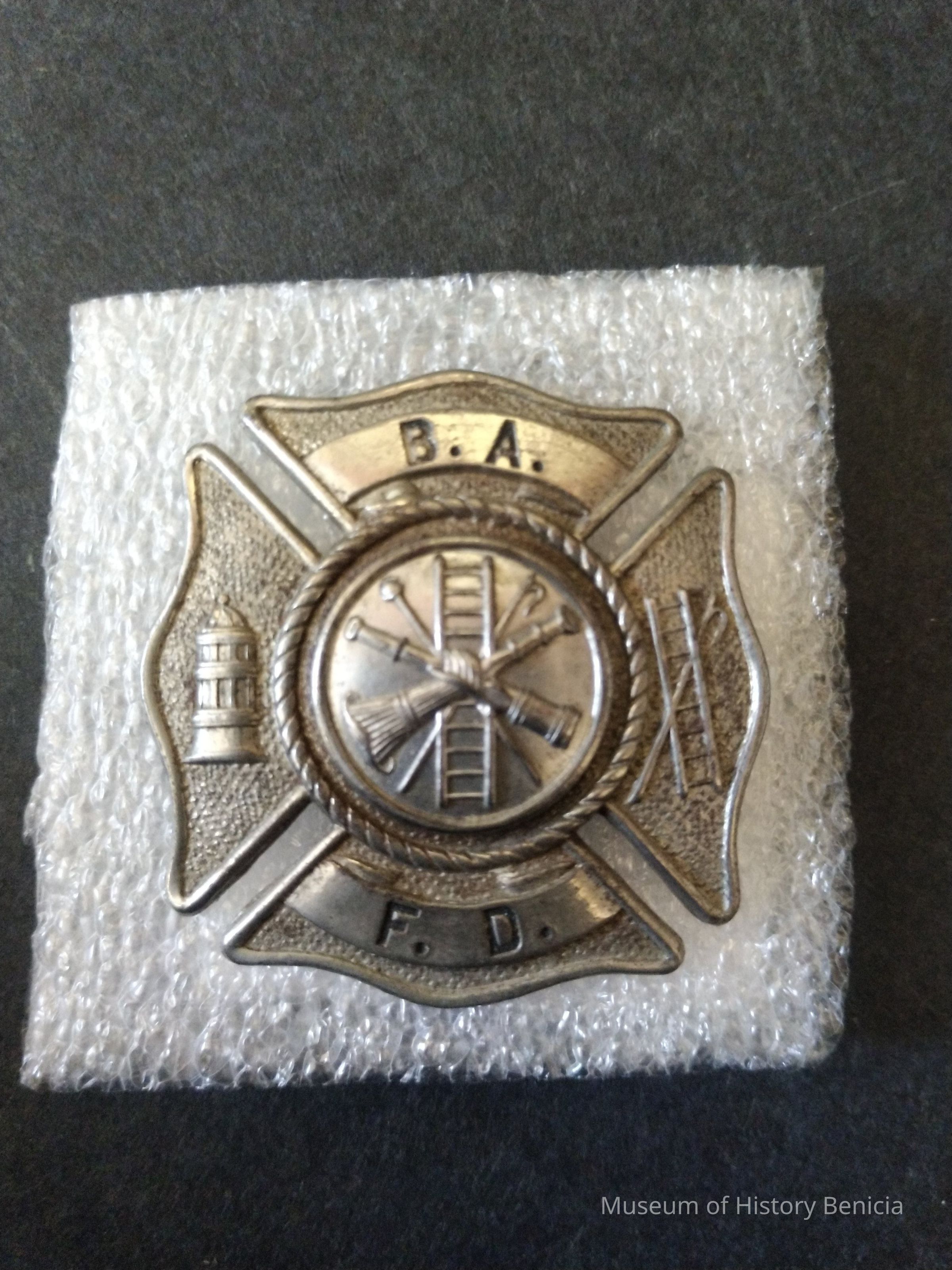 Silver colored metal B.A.F.D. - Benicia Arsenal Fire Dept. Screw backed hat badge