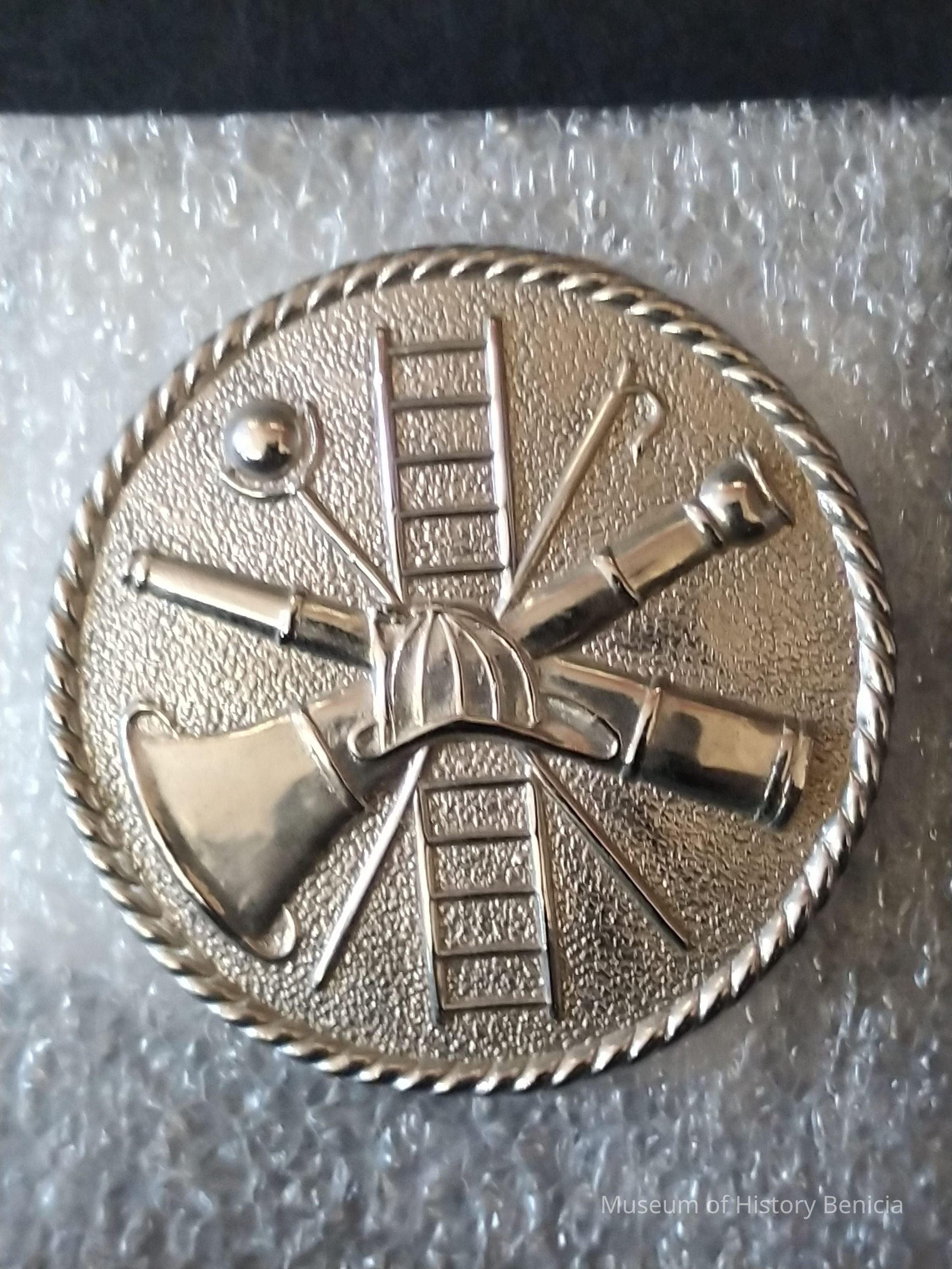 Silver colored round badge with crossed fire appratus - Screw Backed badge