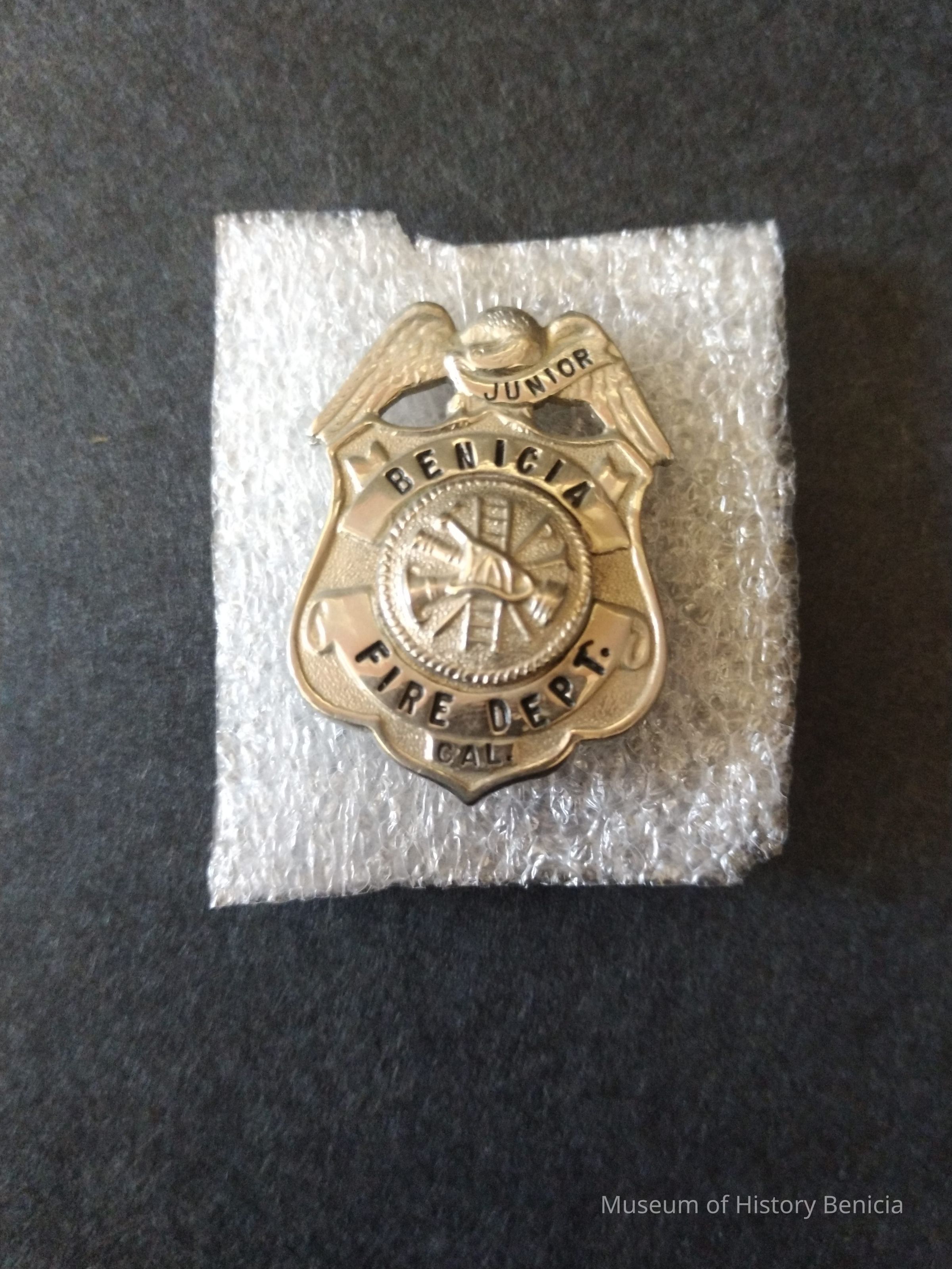 Small silver colored metal Benicia Fire Dept. CAL. Junior Badge - Pin Back - Pin portion has been replaced and not reach the clasp