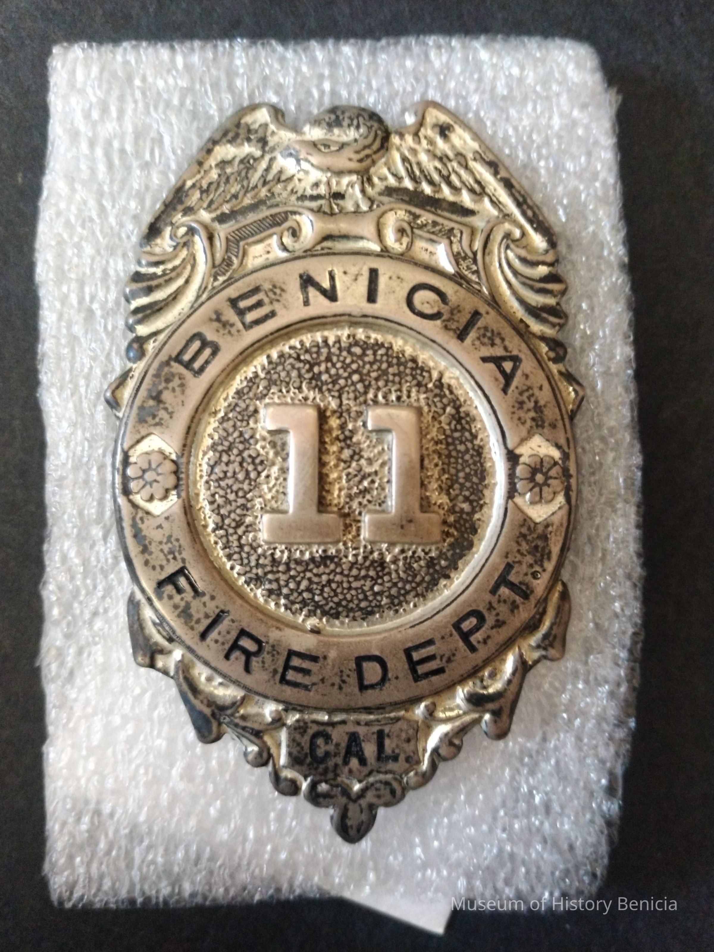 Stirling Benicia Fire Dept. Badge - Pin Back - Badge No. 11 - Sticker on reverse 0015 - Pin missing and replaced with wire - Used by Benicia Volunteer