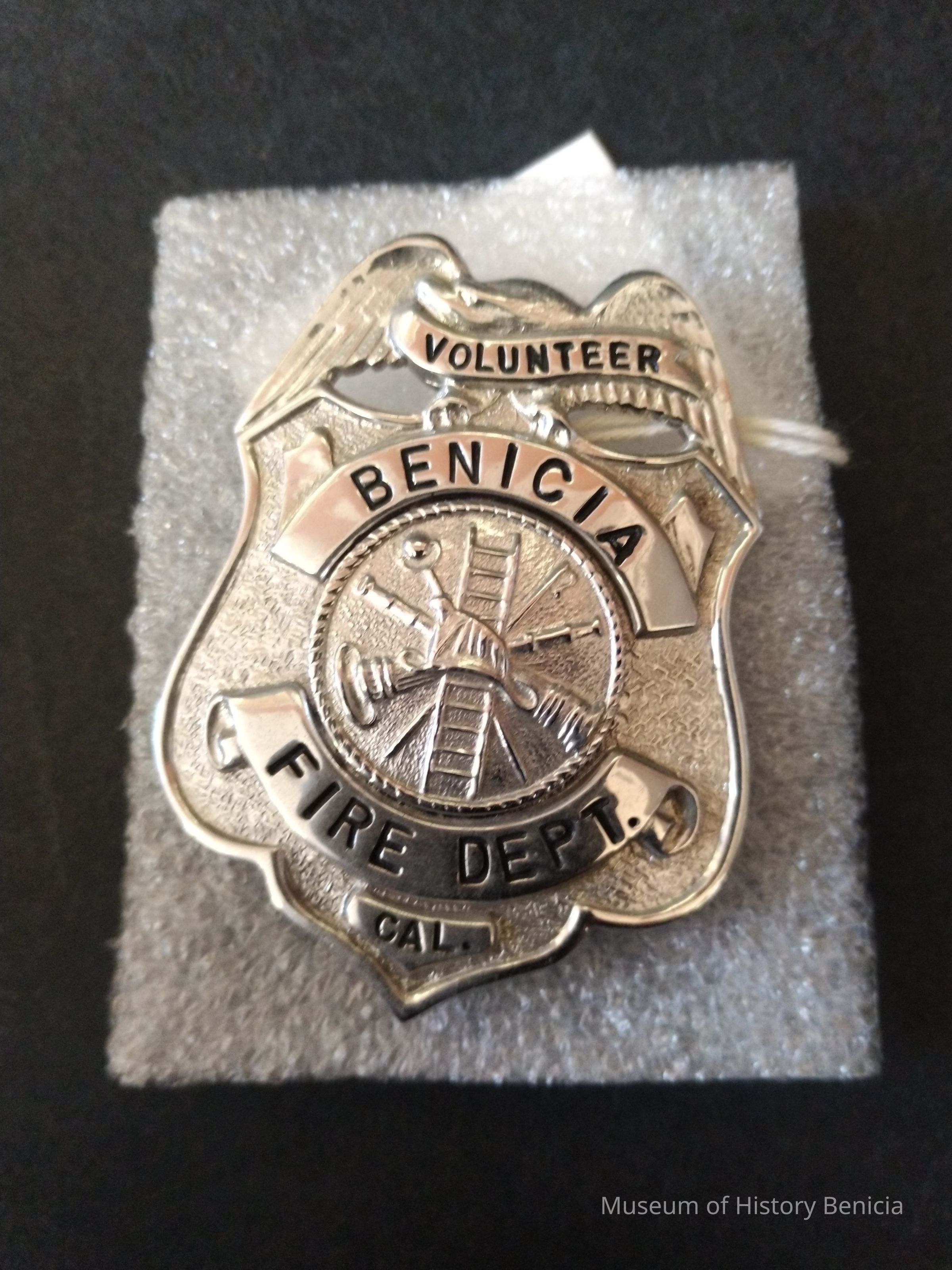 Silver colored Benicia Volunteer Fire Dept. CAL. Badge - Pin Back - Blackmintin
