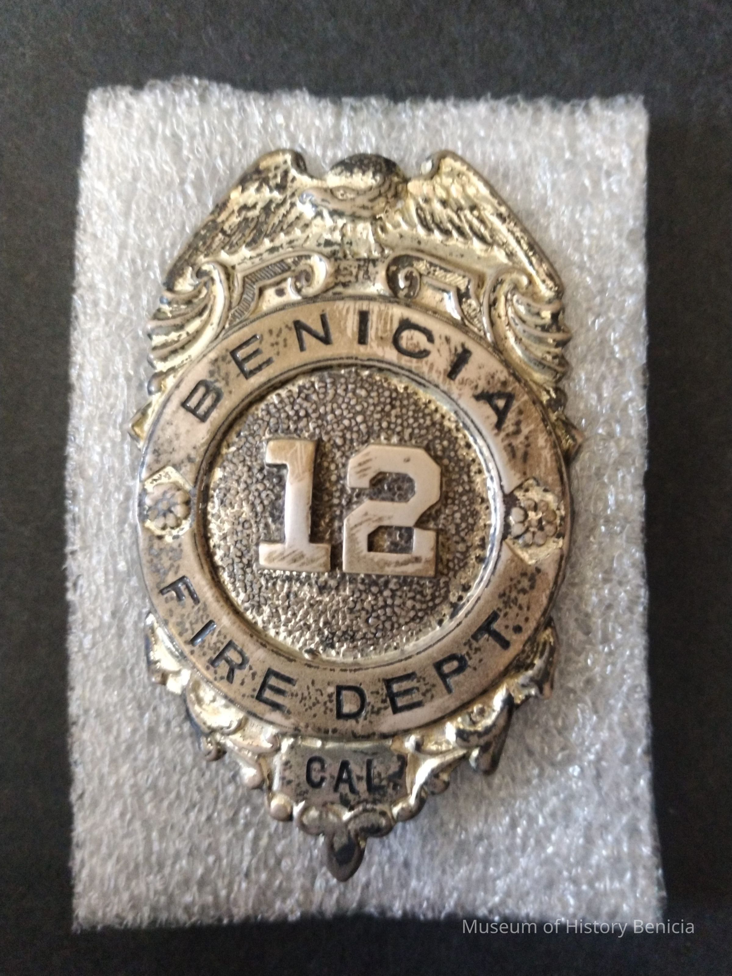 Stirling silver Benicia Fire Dept. CAL. Badge - Pin Back - Badge No. 12 - A[ Scratched into reverse - Sticker on reverse 0016 c. 1940s - Used by Benicia VolunteersCollection