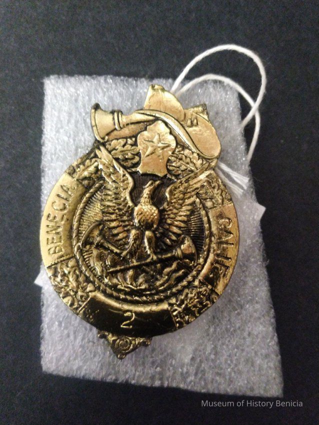 Gold colored, probably pot metal pun back "badge." The text reads Benicia Calif. 2 This item did not start its life out as a badge/pin. See condition report