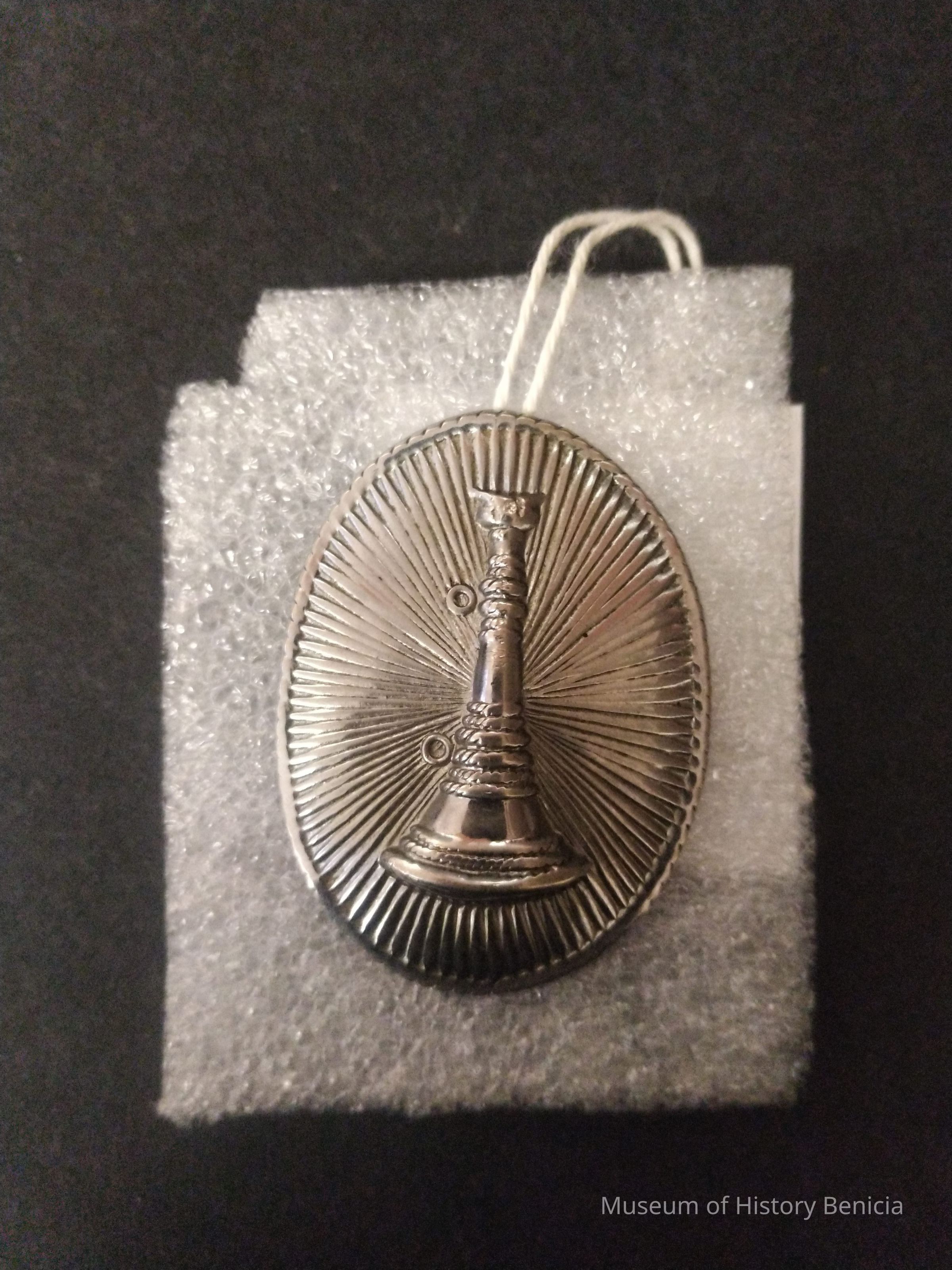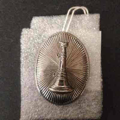 Silver, oval pin with raise fire apparatus.
