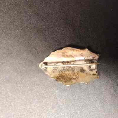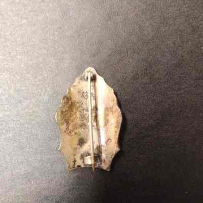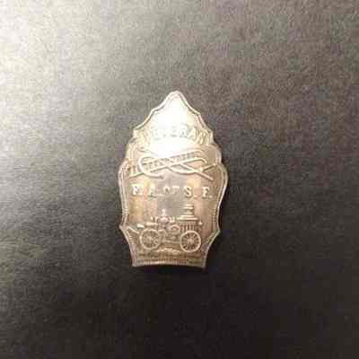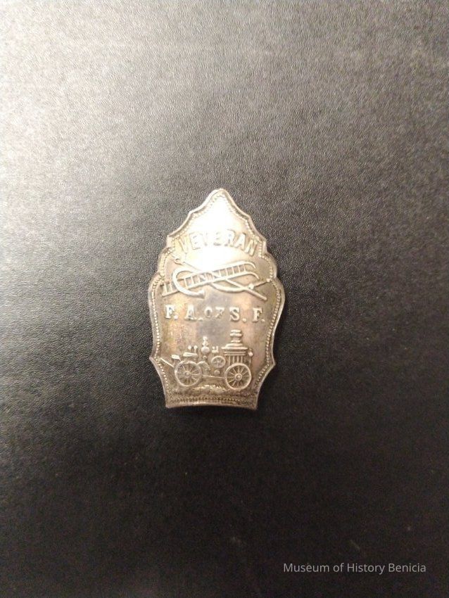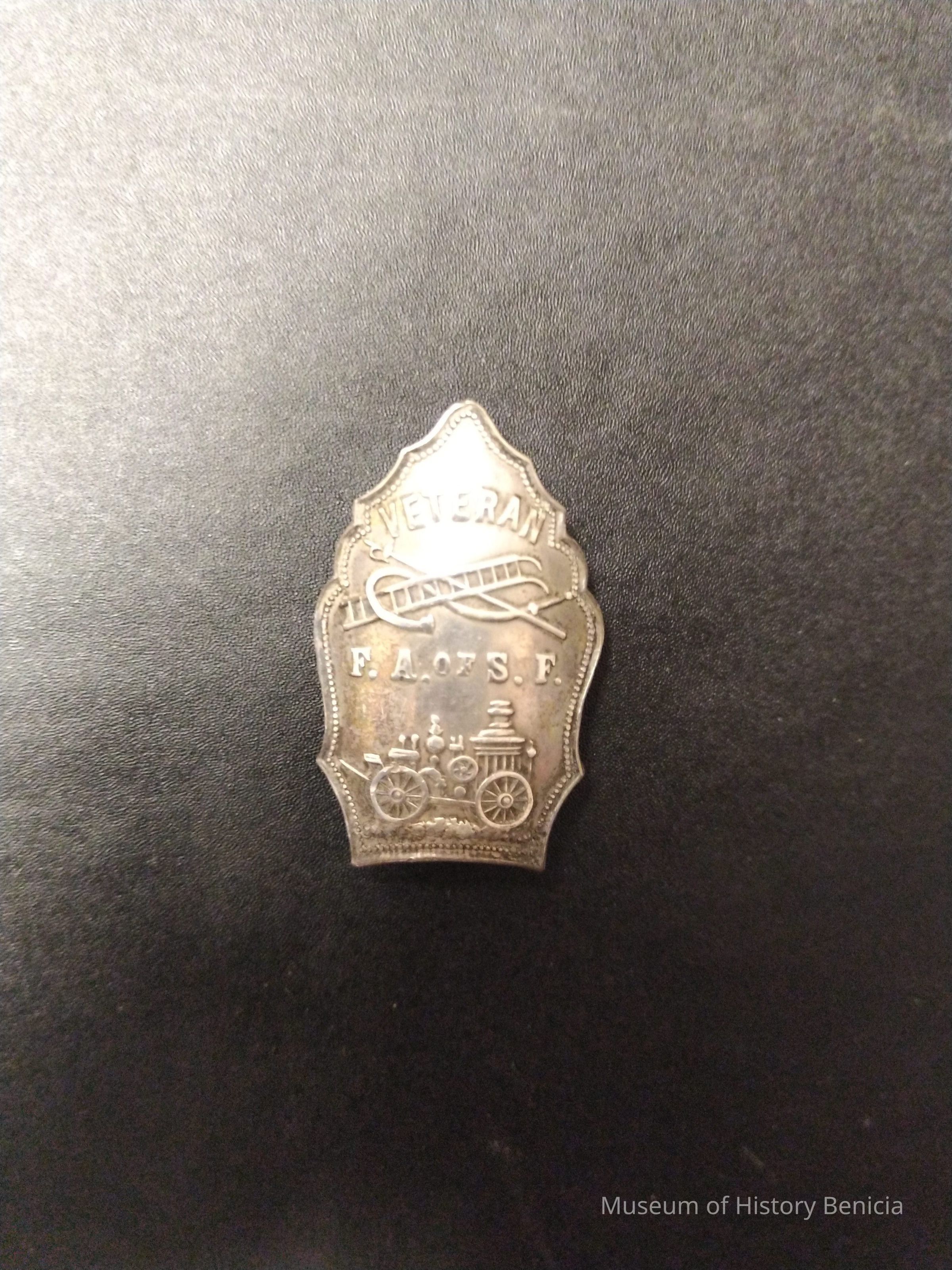 Stirling Pin in shape of Fire helmet shield - Veteran F.A.of S.F. - Image of pumper and crossed fire fighting tools