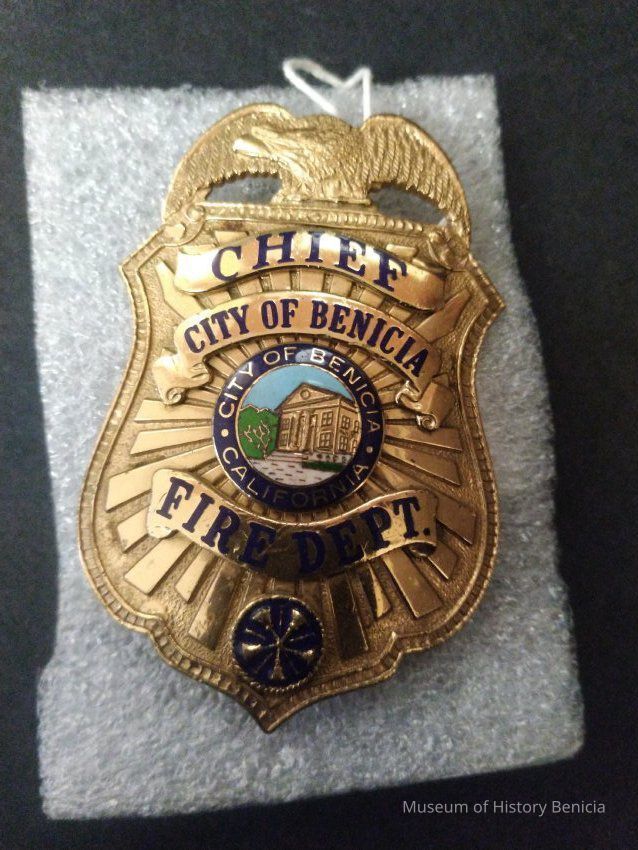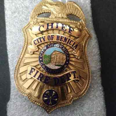 Gold plated/washed City of Benicia Fire Xhief Fire Dept. badge with enamaled city logo in center