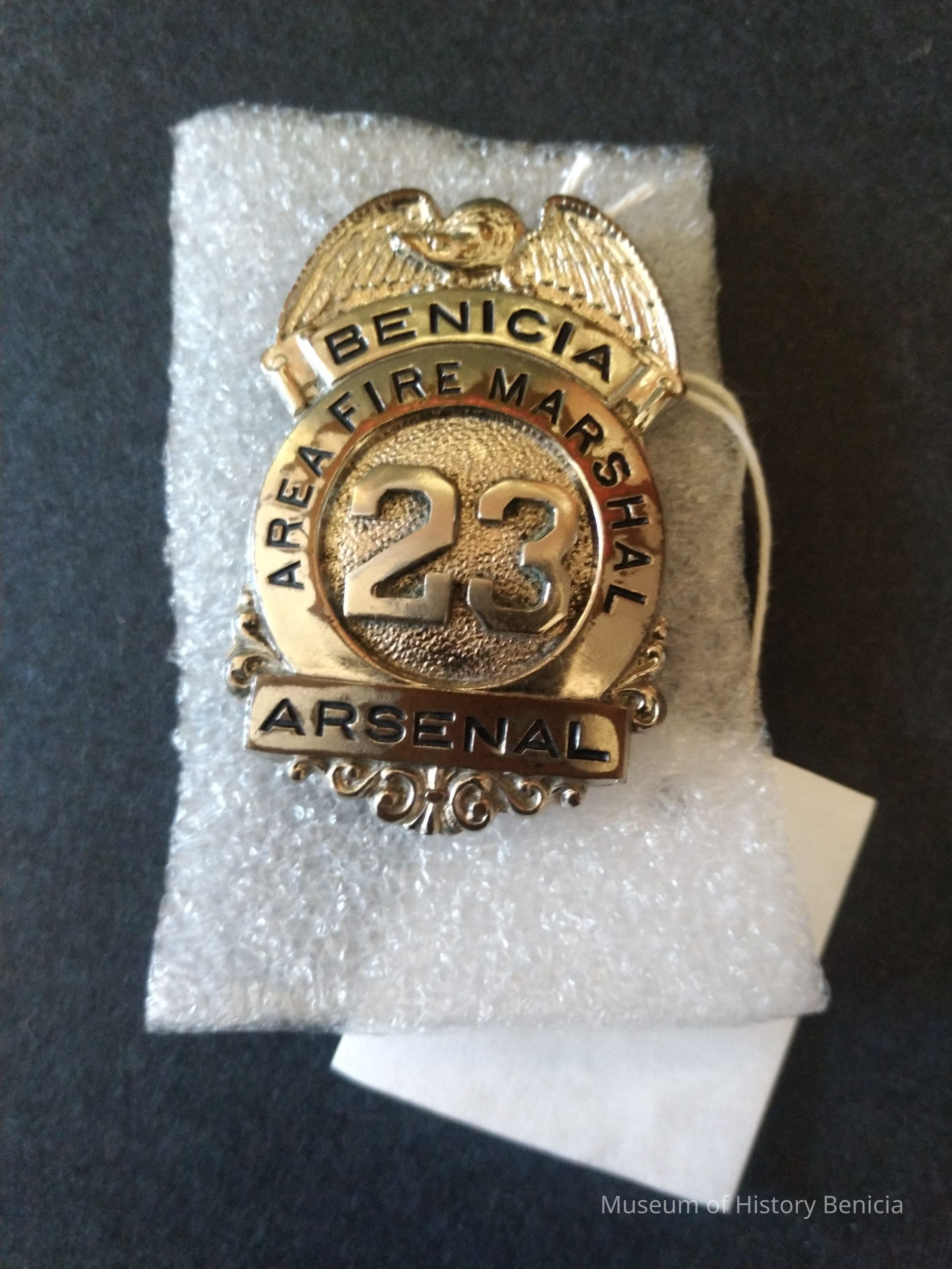 Silver colored metal Benicia Arsenal Area Fire Marshal pin back badge - badge number 23