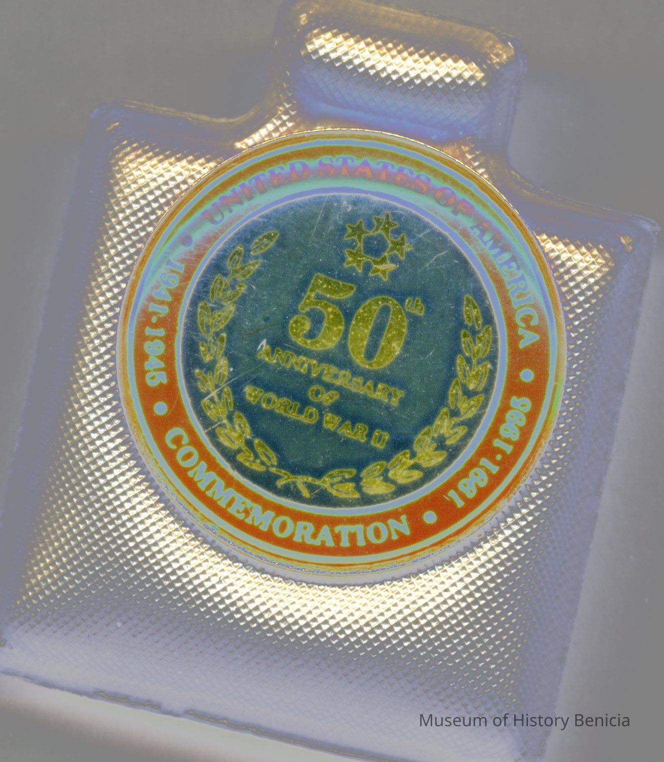 This is a pin commemorating the 50th anniversary of the end of World War II. The pin is red and black and only .75" in diameter. It says United States of America around the outside and the dates 1941*1945 Commeneration 1991*1995.Collection