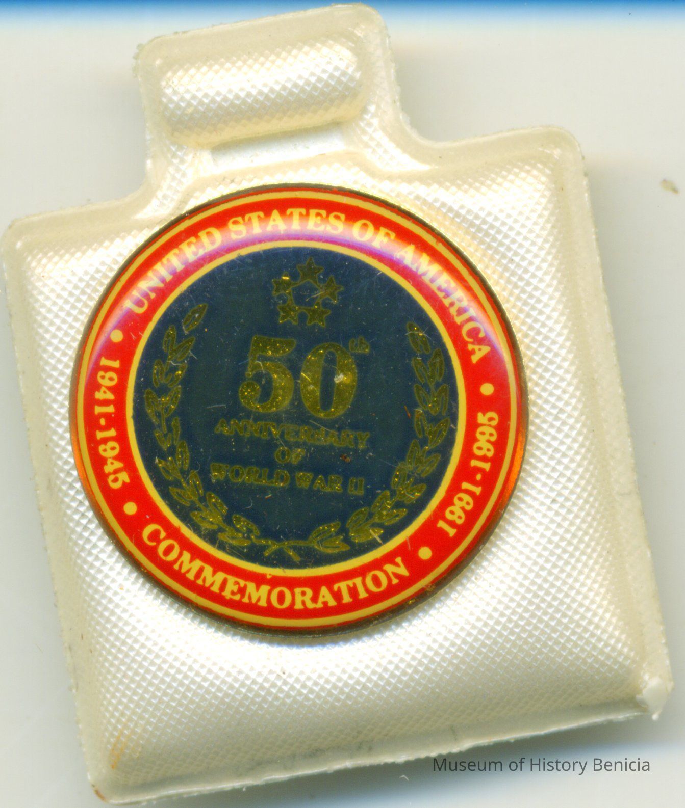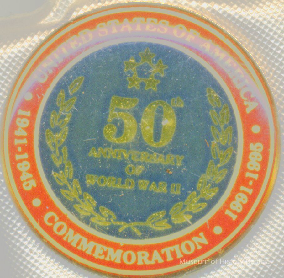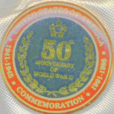 This is a pin commemorating the 50th anniversary of the end of World War II. The pin is red and black and only .75" in diameter. It says United States of America around the outside and the dates 1941*1945 Commeneration 1991*1995.Collection