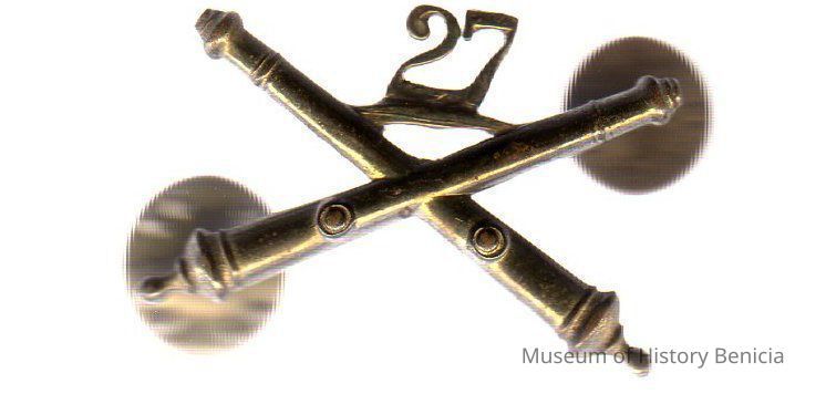 lapel/breast insignia pin "27th Anti-Aircraft Artillery Battalion" brass corssed cannot with "27" above attached with 2 clutch push-on backs on posts