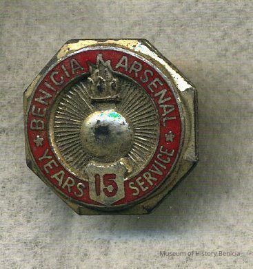 Lapel Pin / Button - recognition for 15 years service, Benicia Arsenal with ordnance bomb logo;